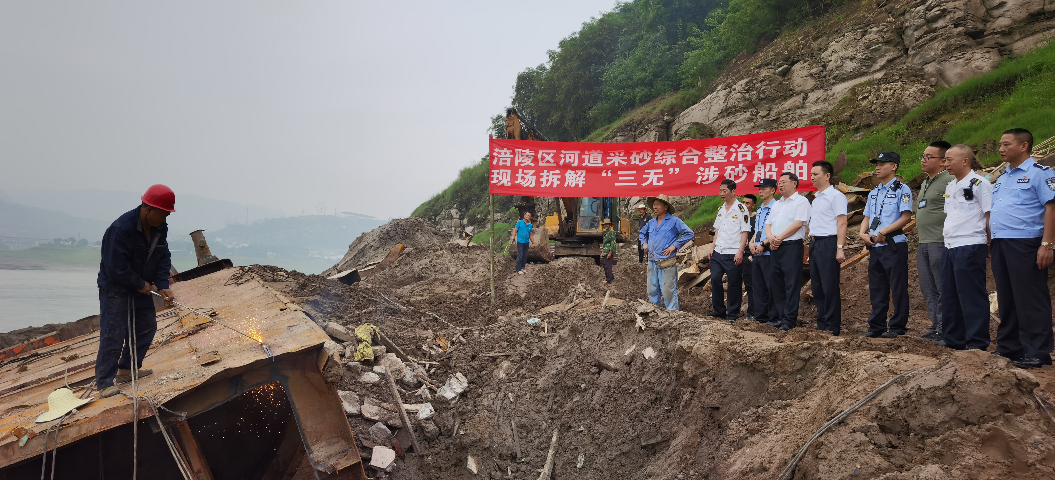 联合执法巡查组在白鹤梁海事码头乘执法艇沿江而上,至涪陵与长寿交界处反水碛水域,对30余公里长的长江沿线开展联合巡查。巡查人员对茶壶碛涉砂船舶集中停靠地停靠的船舶及部分船主进行了走访,对他们进行《中华人民共和国长江保护法》及河道采砂现行政策的宣传。随后,在蔺市镇岸边对前期巡查中发现的“三无”涉砂船舶进行了现场拆解。