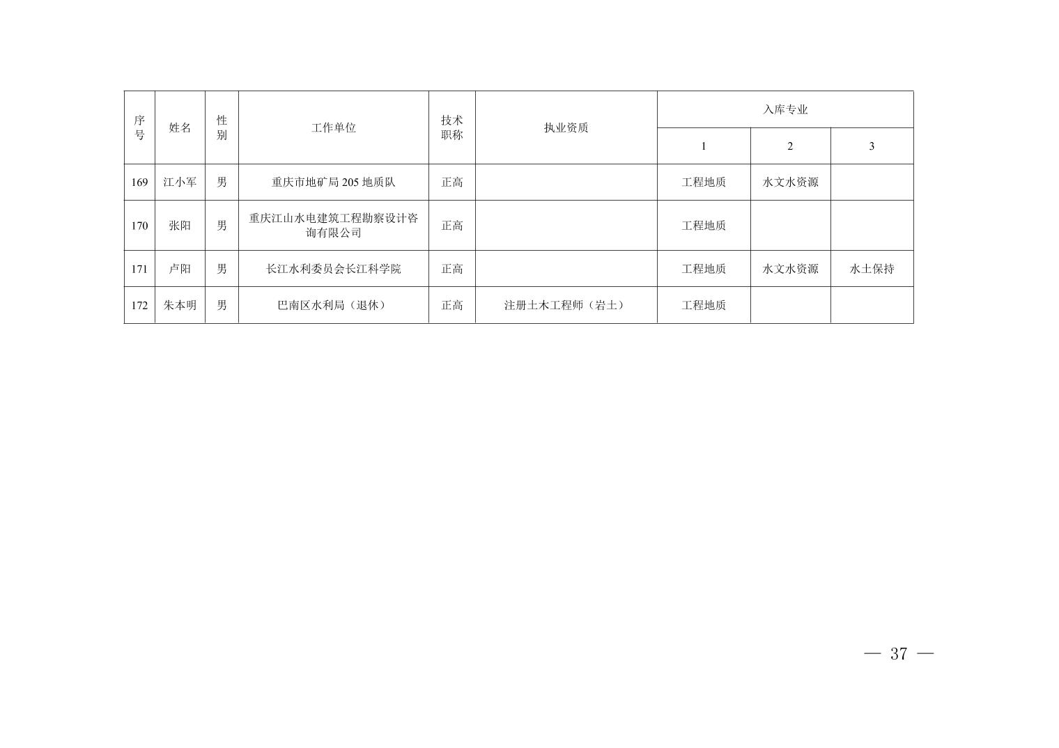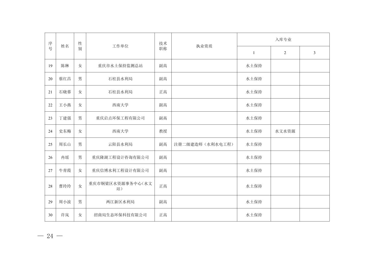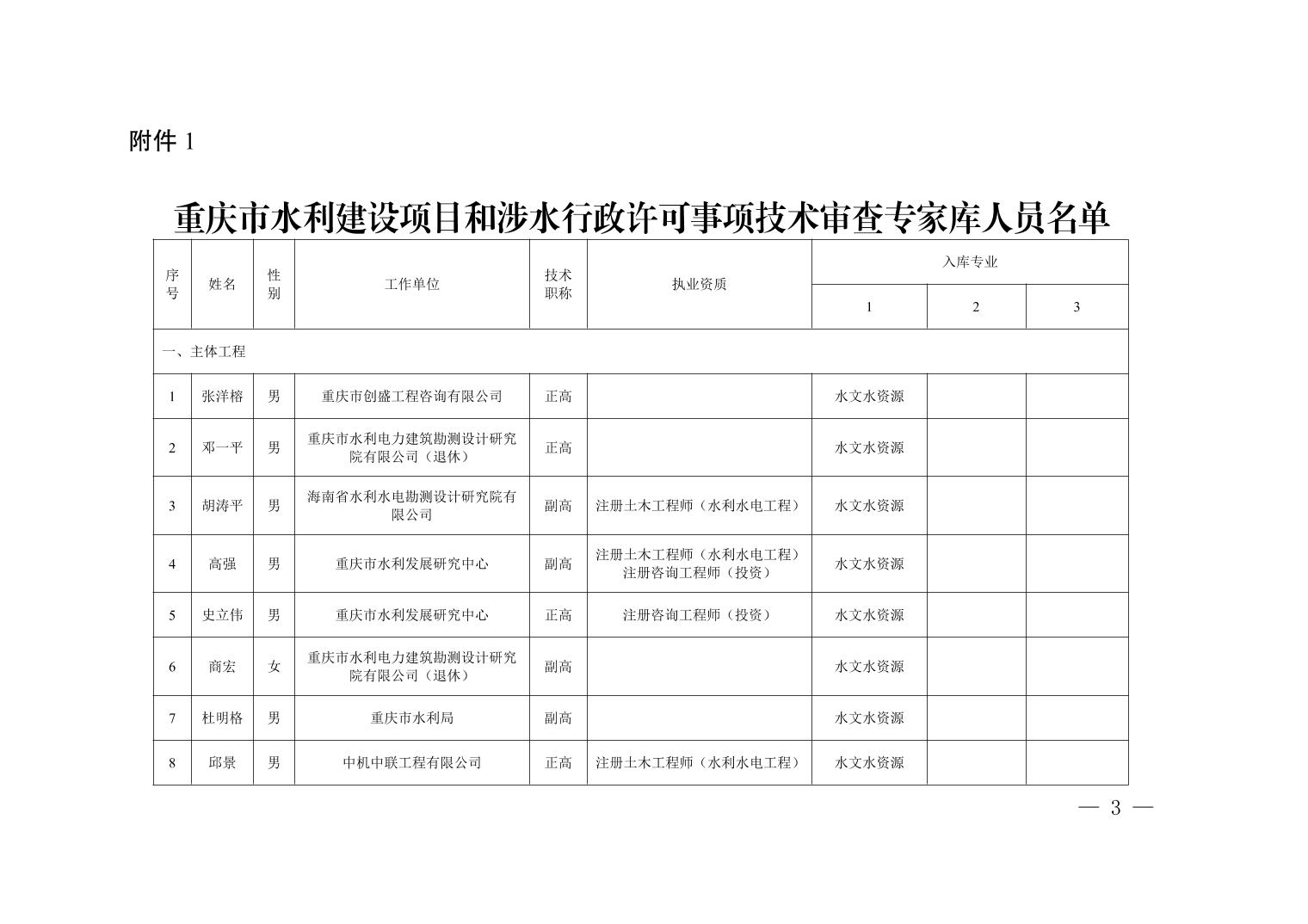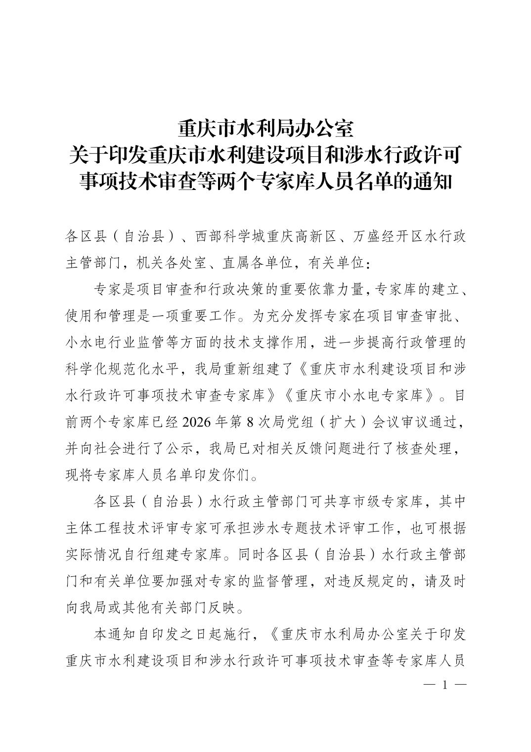 全文下载:重庆市水利局办公室关于印发重庆市水利建设项目和涉水行政许可事项技术审查等两个专家库人员名单的通知.docx