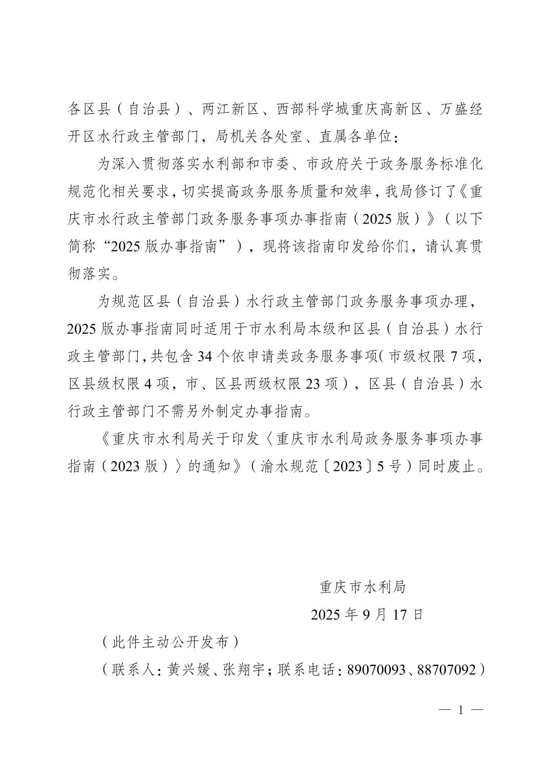 重庆市水利局关于印发《重庆市水行政主管部门政务服务事项办事指南(2025版)》的通知