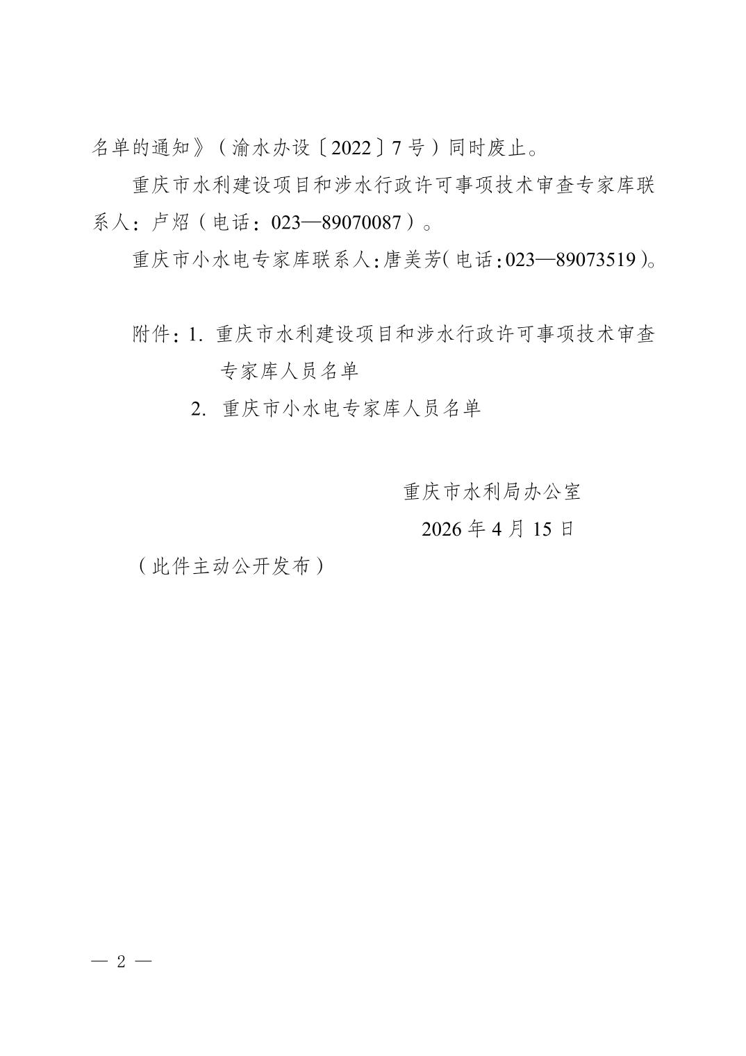 重庆市水利局办公室关于印发重庆市水利建设项目和涉水行政许可事项技术审查等两个专家库人员名单的通知