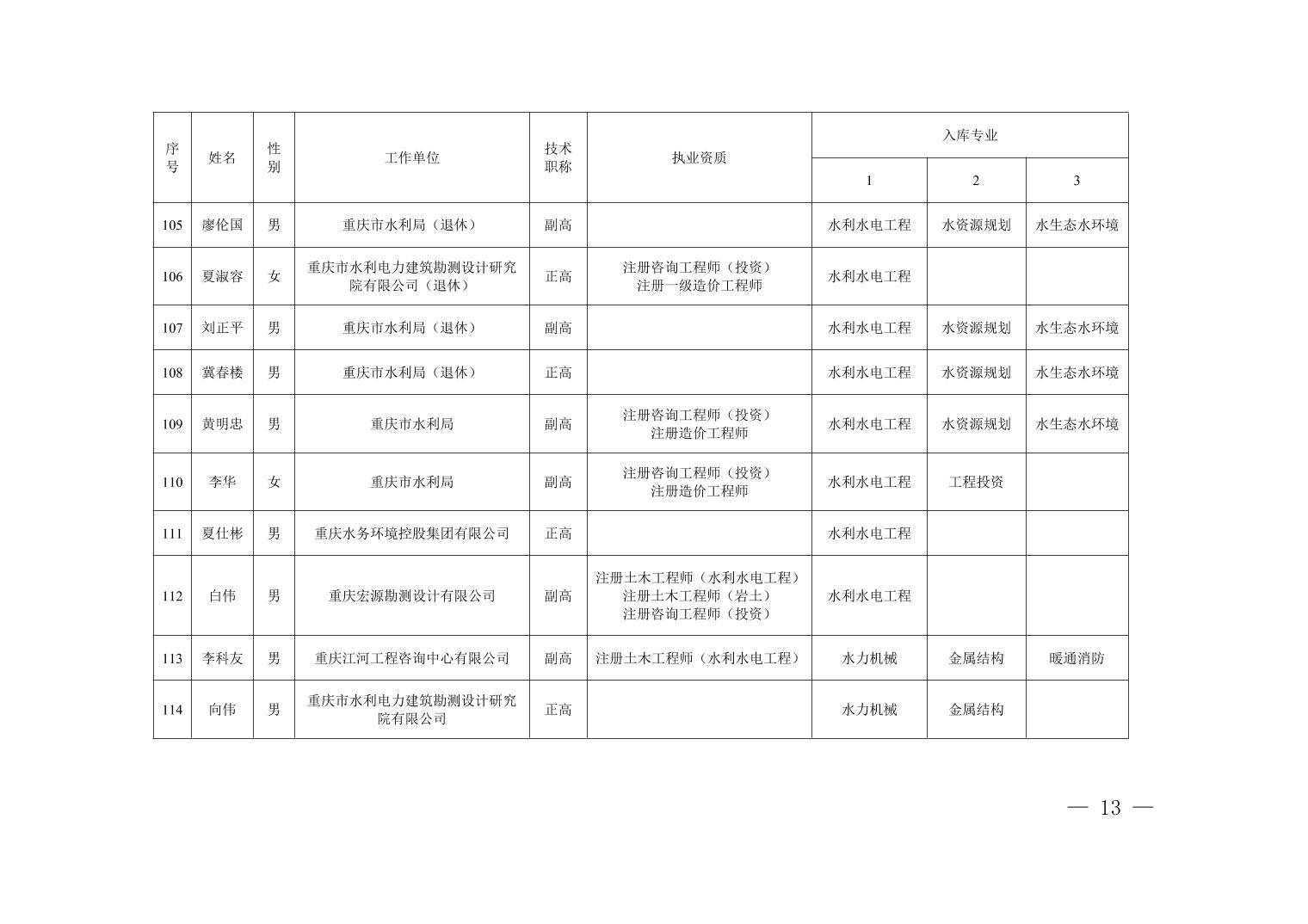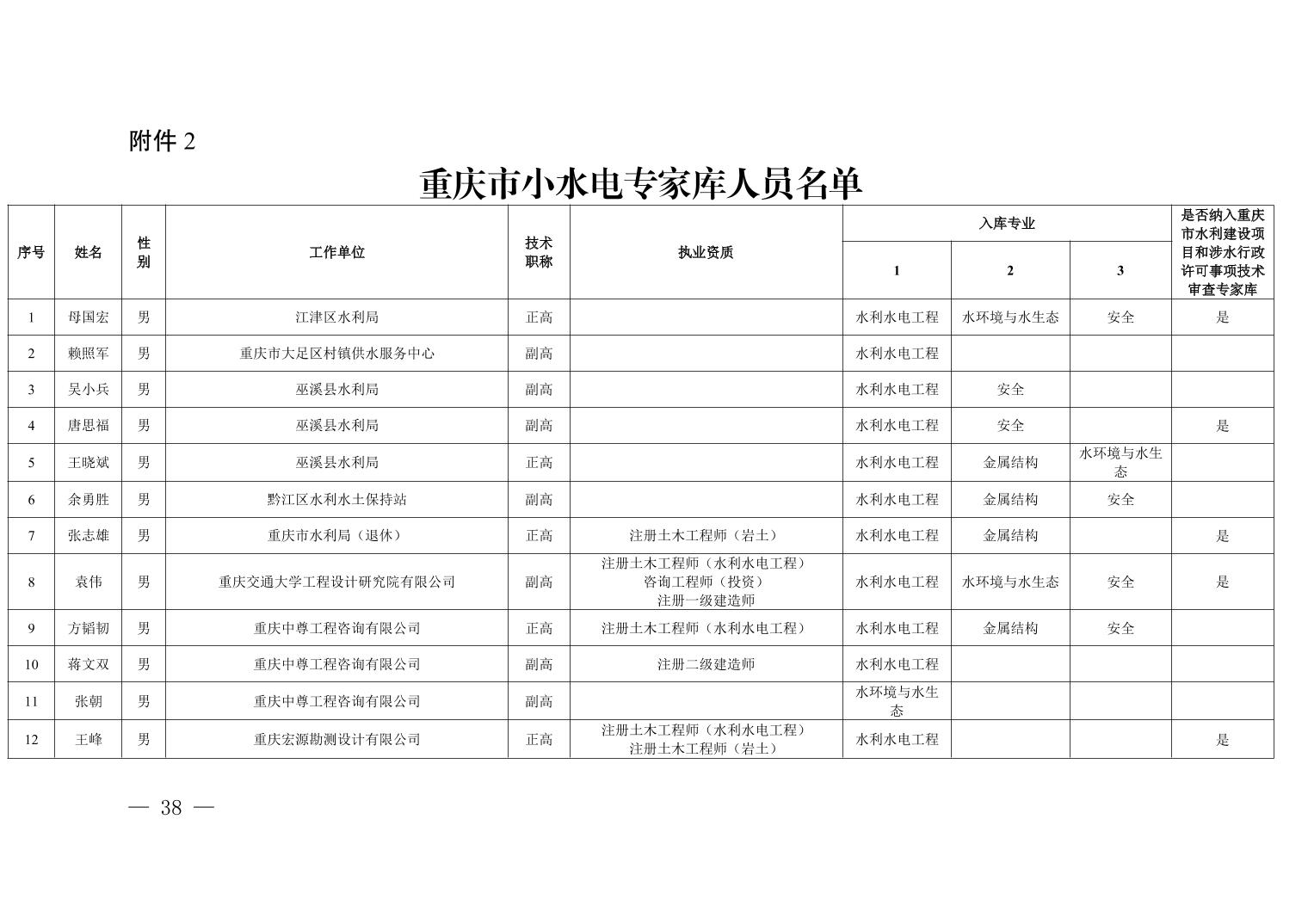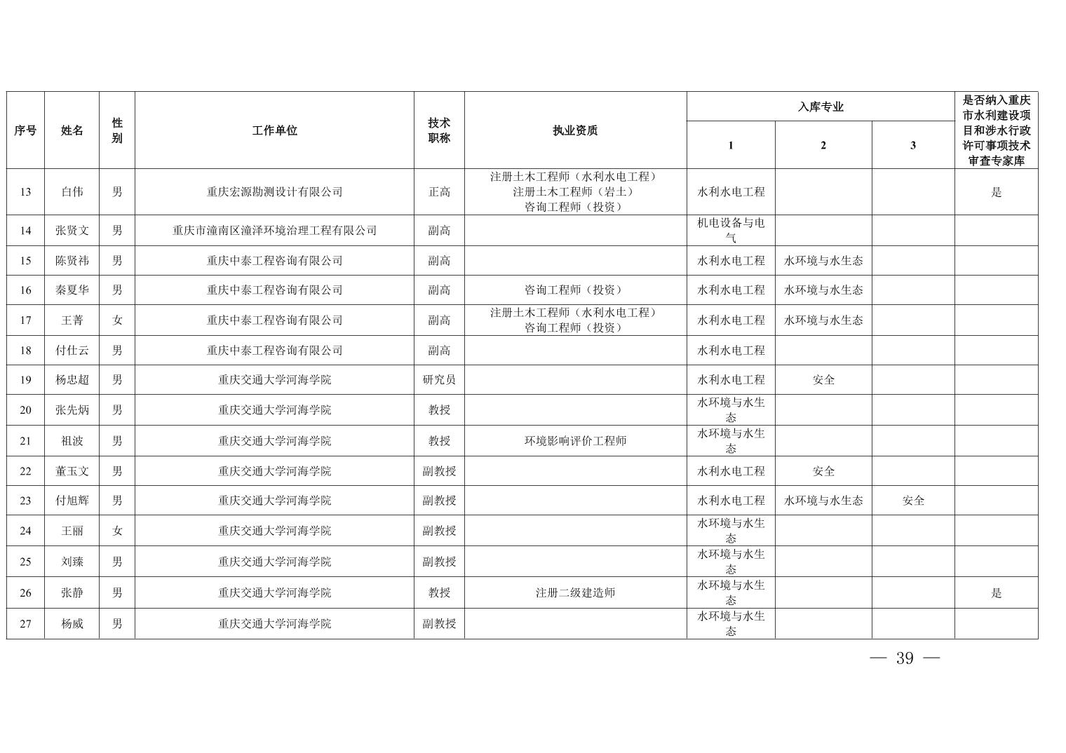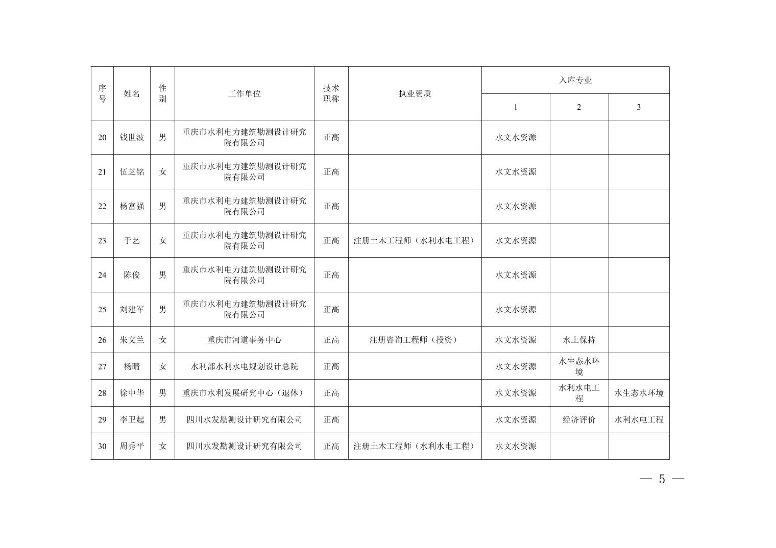 全文下载:重庆市水利局办公室关于印发重庆市水利建设项目和涉水行政许可事项技术审查等两个专家库人员名单的通知.docx