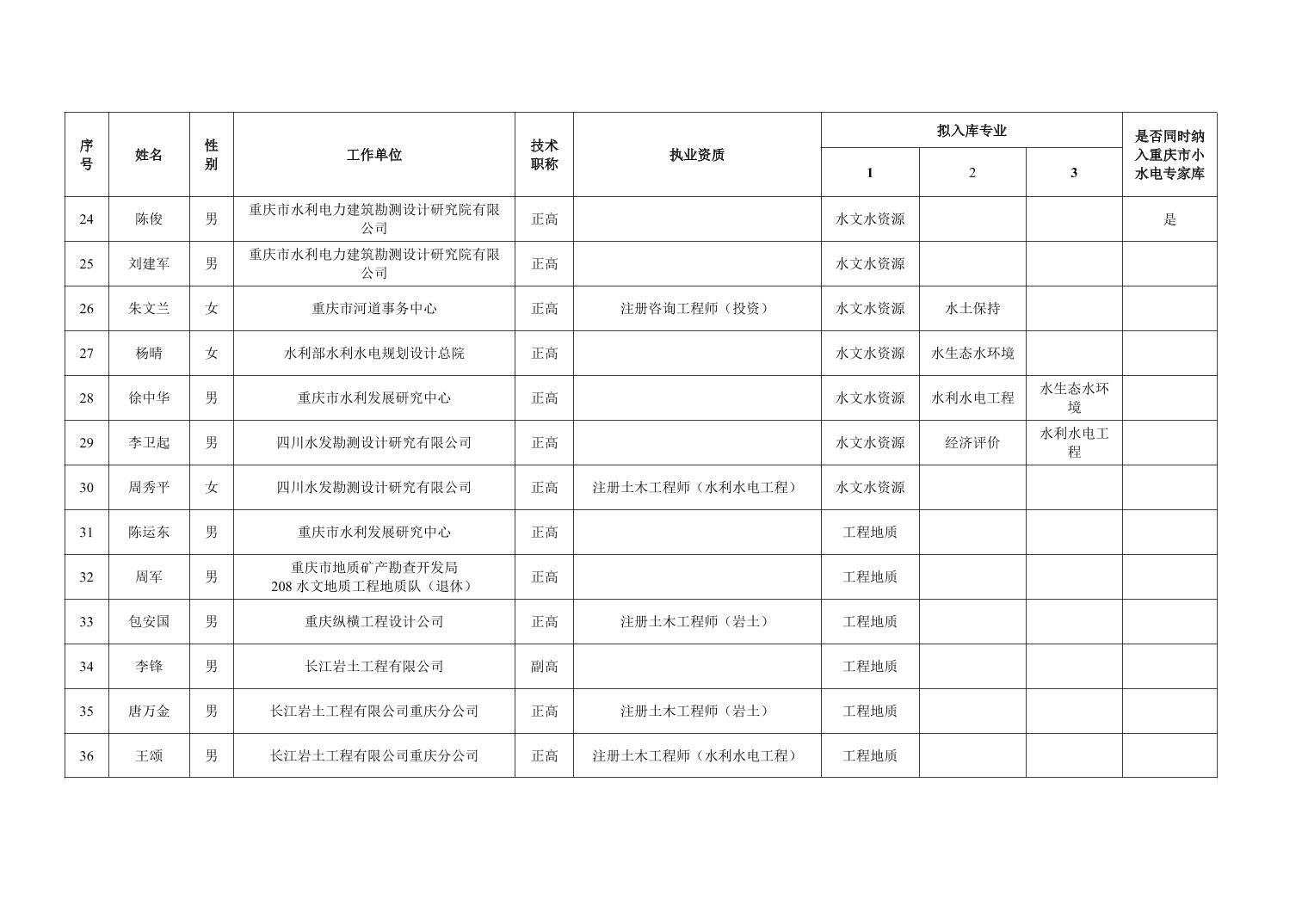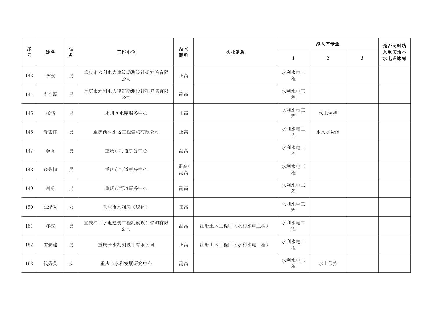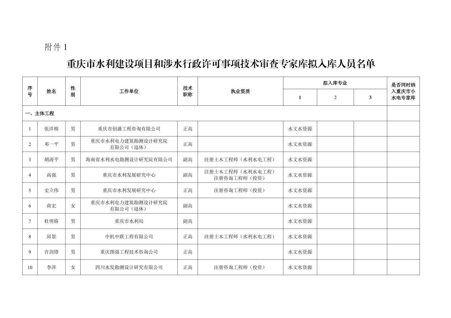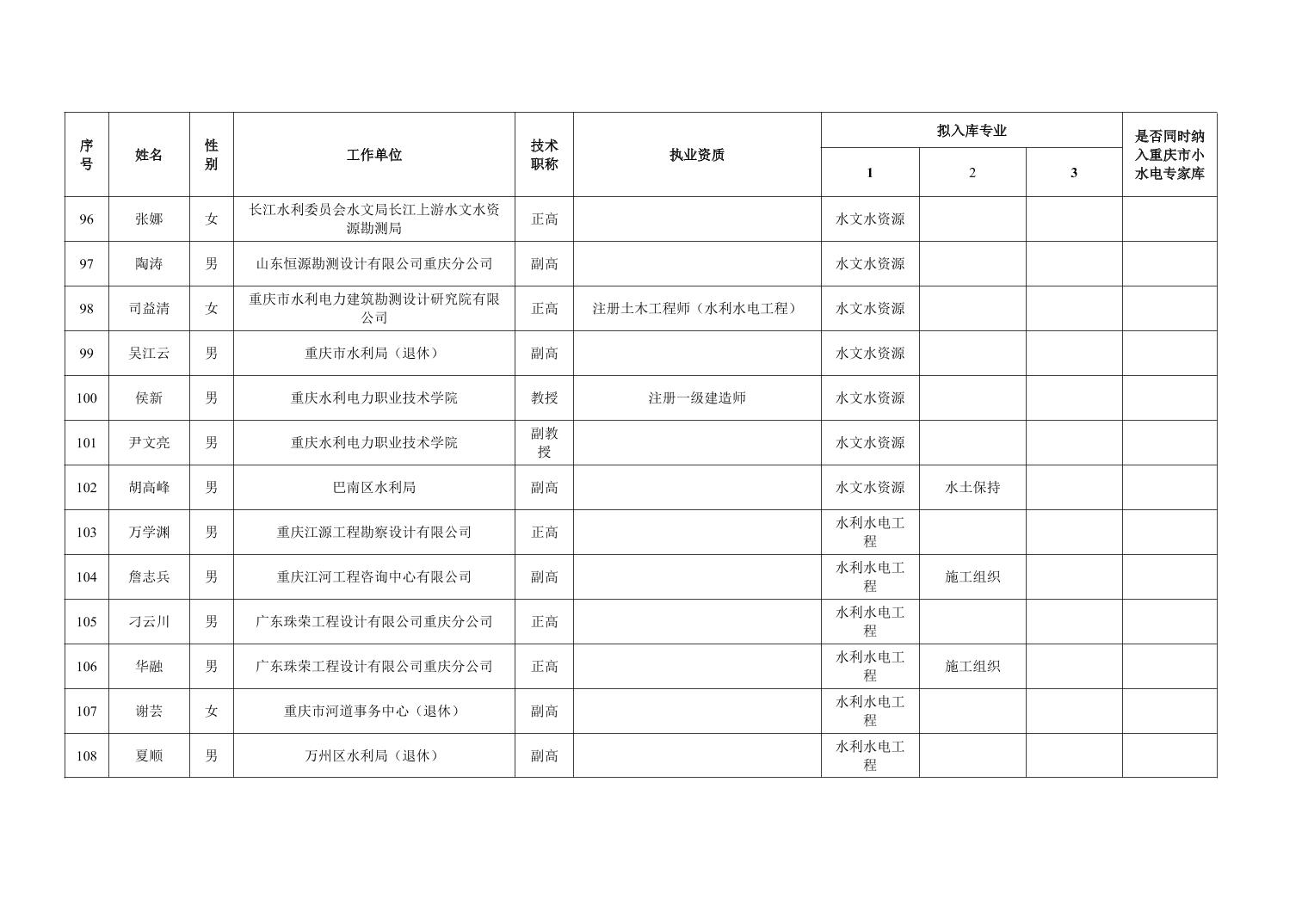 重庆市水利局办公室关于重庆市水利建设项目和涉水行政许可事项技术审查等两个专家库拟入库人员名单的公示