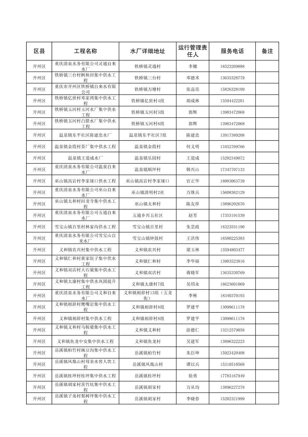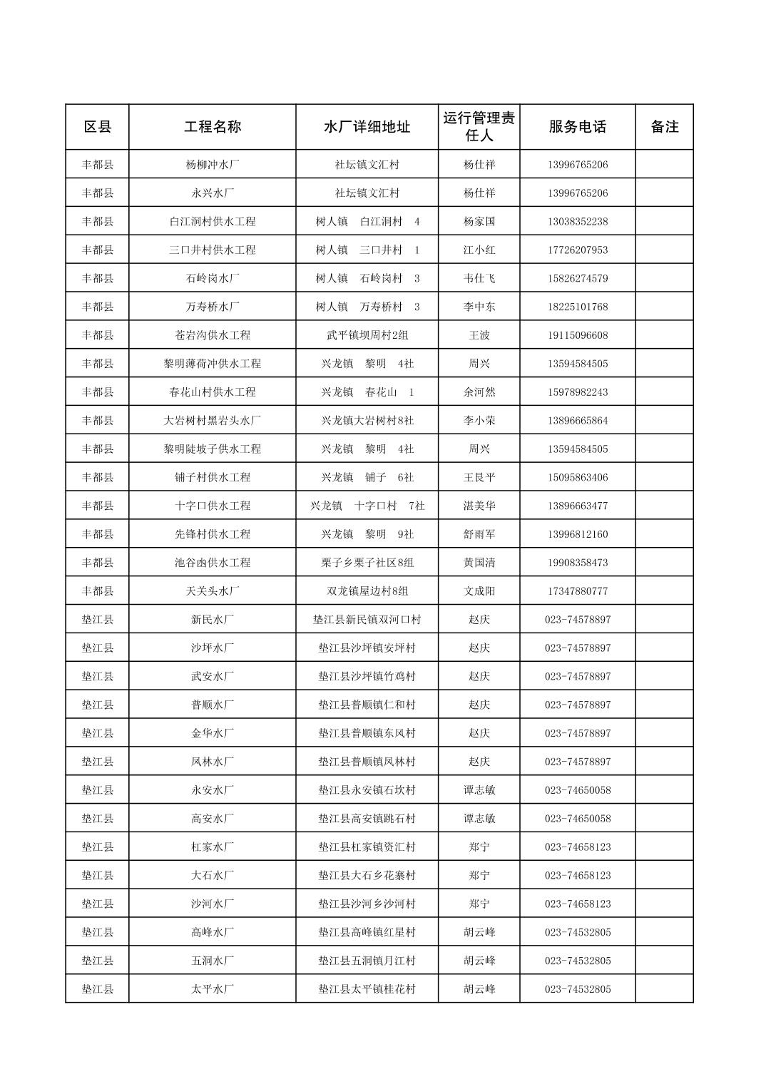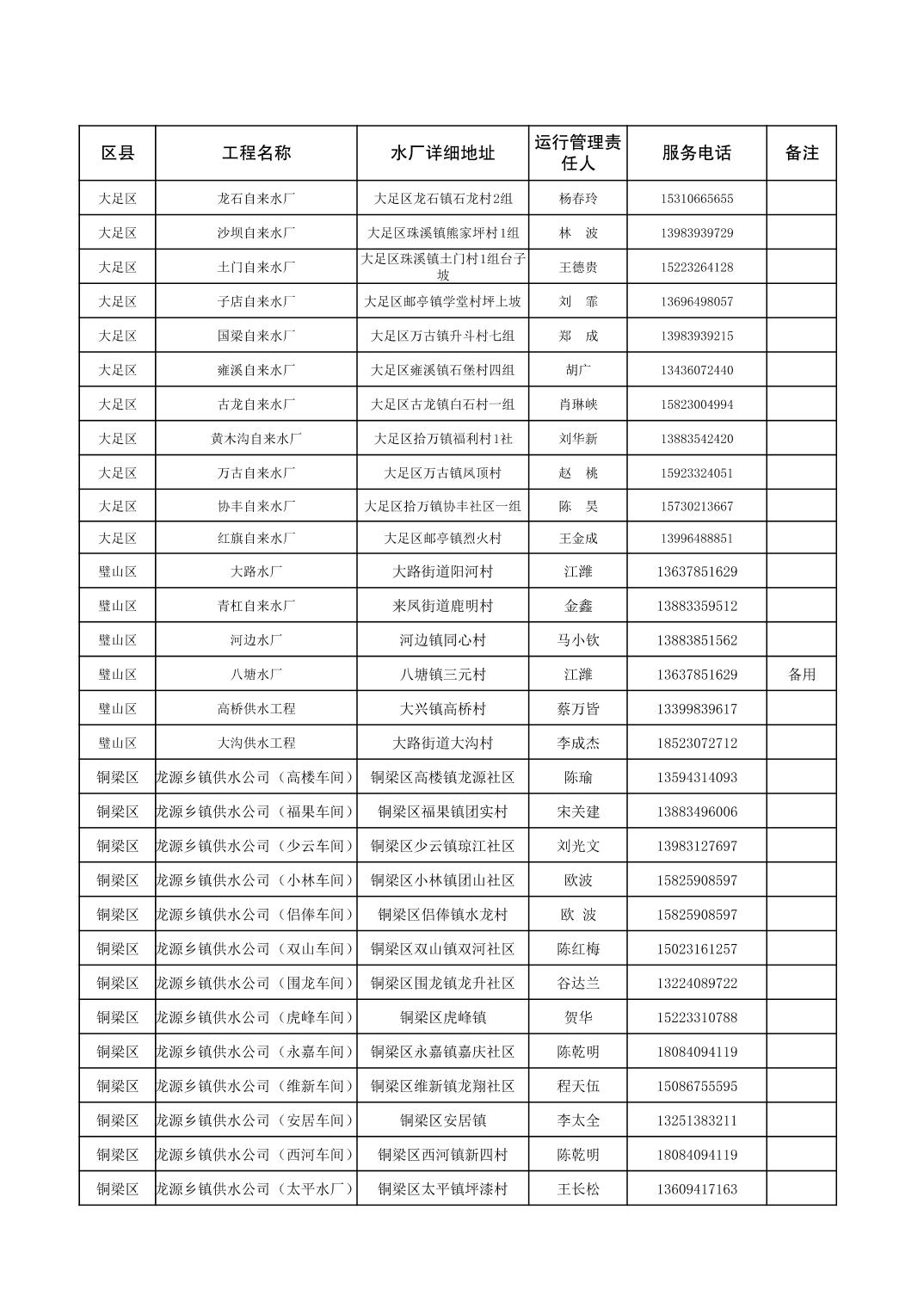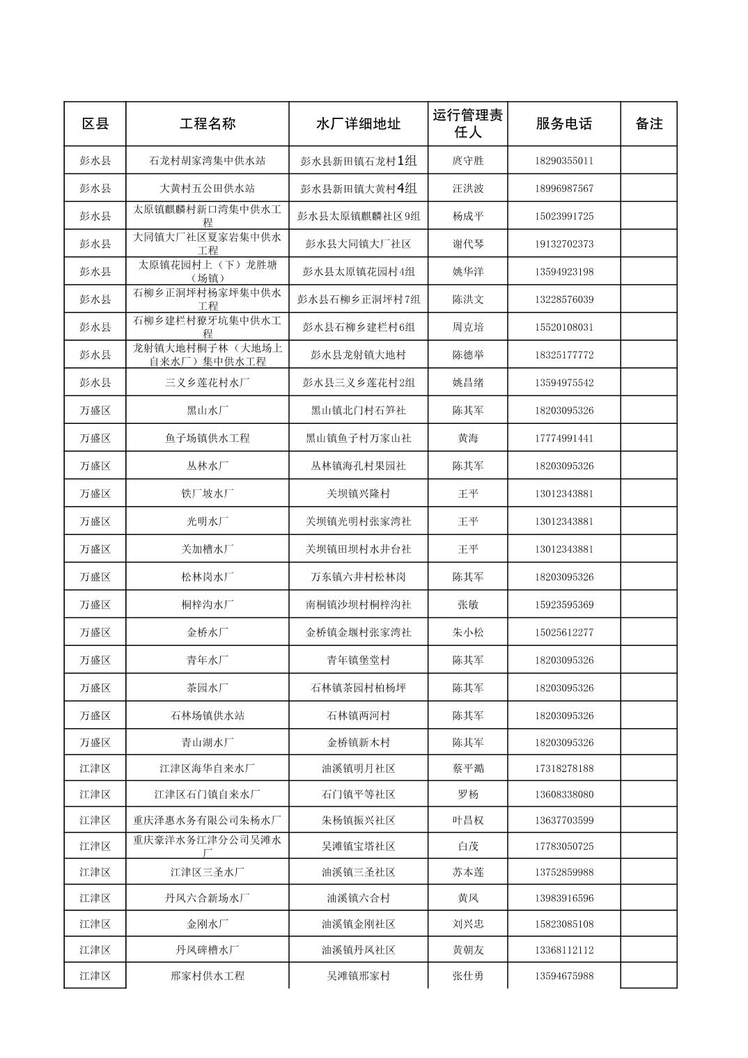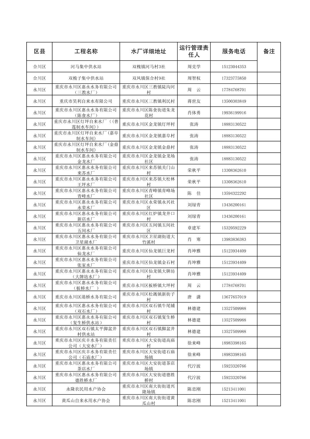 重庆市千人以上农村供水工程运行管理责任人及服务电话