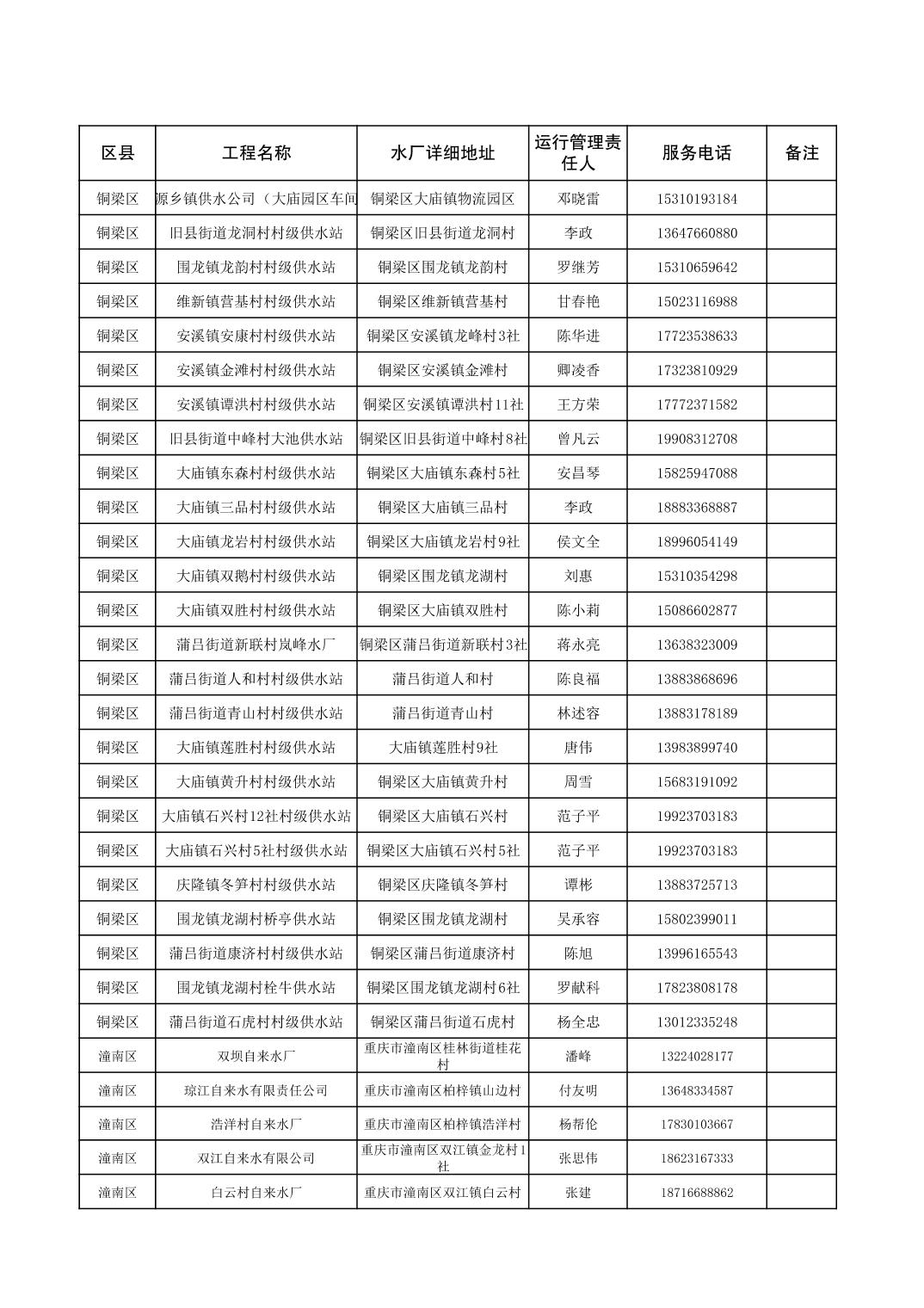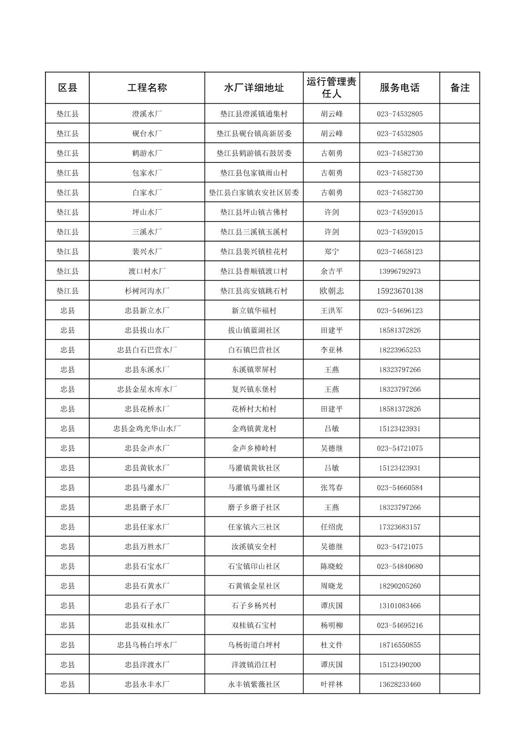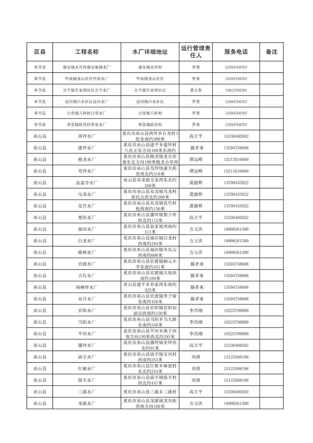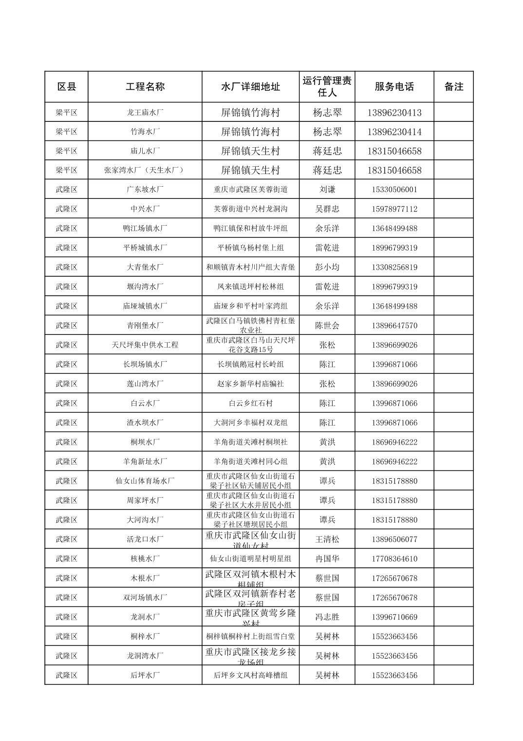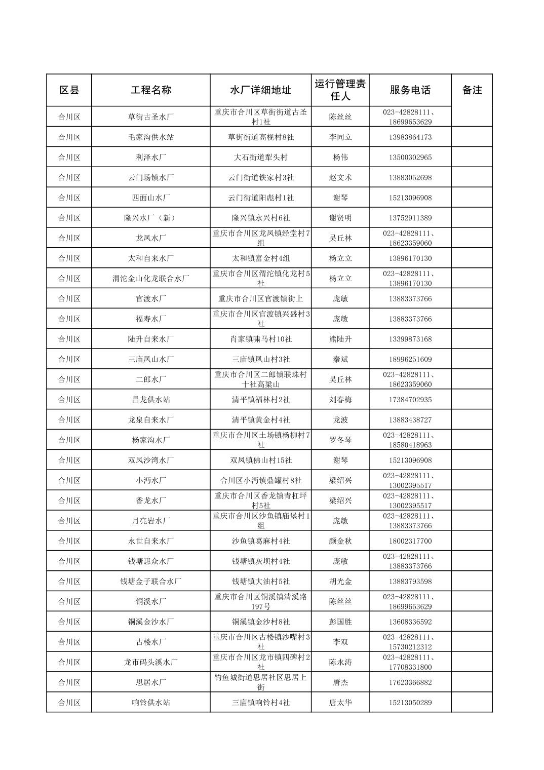 重庆市千人以上农村供水工程运行管理责任人及服务电话