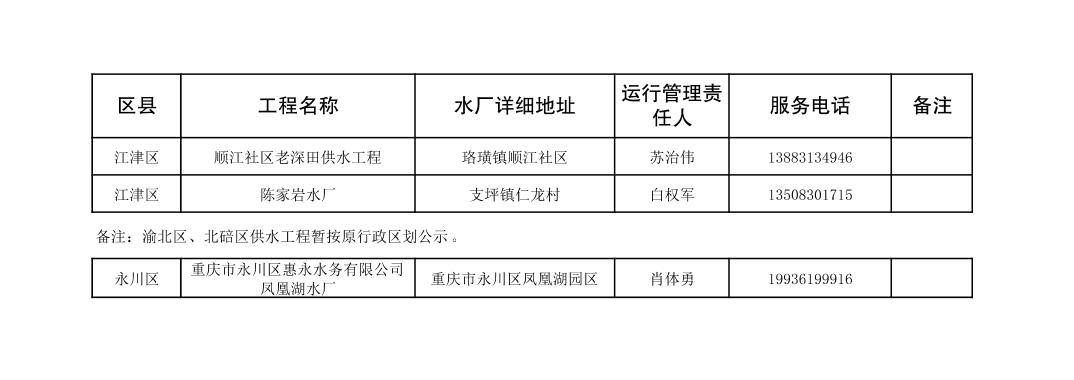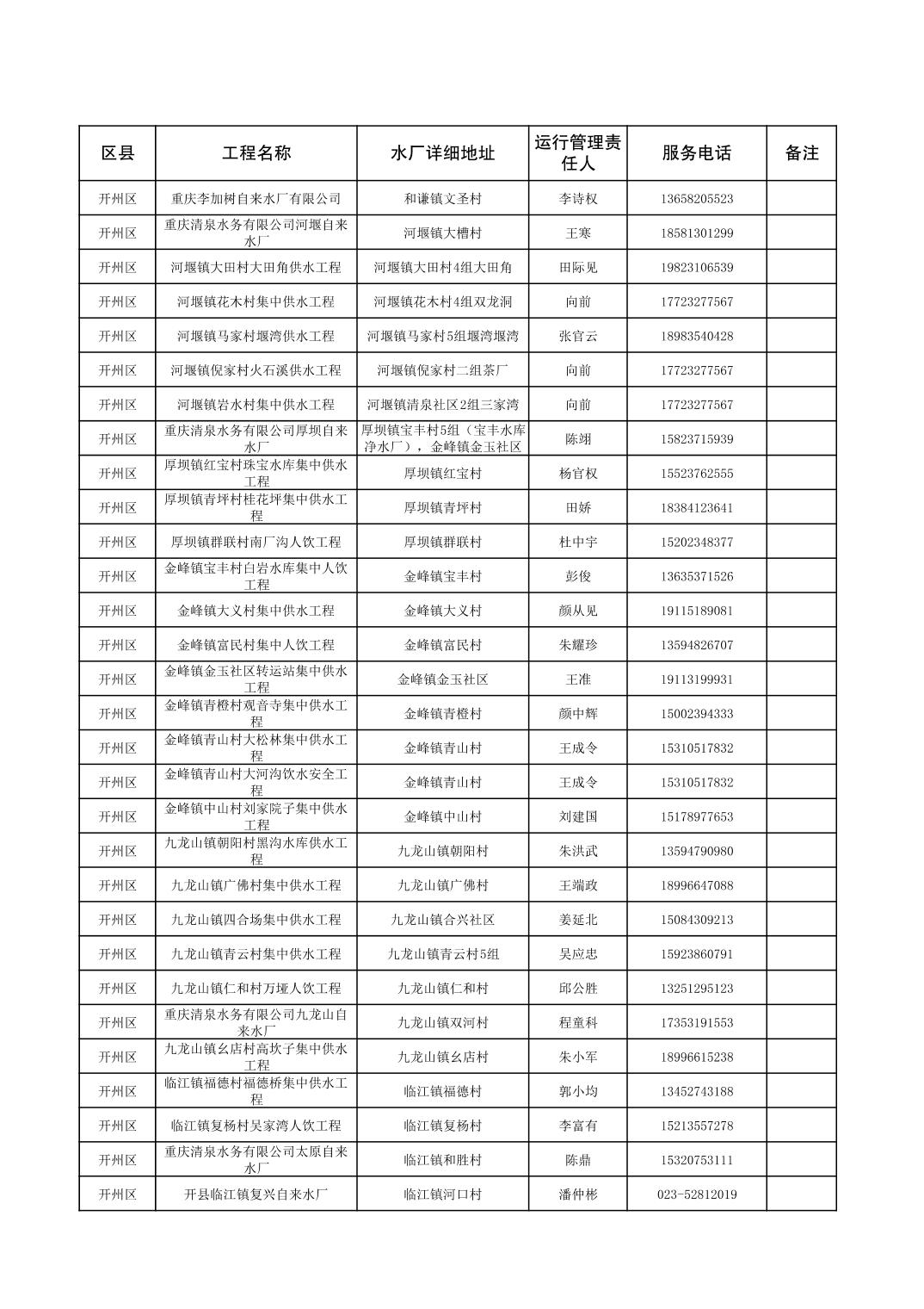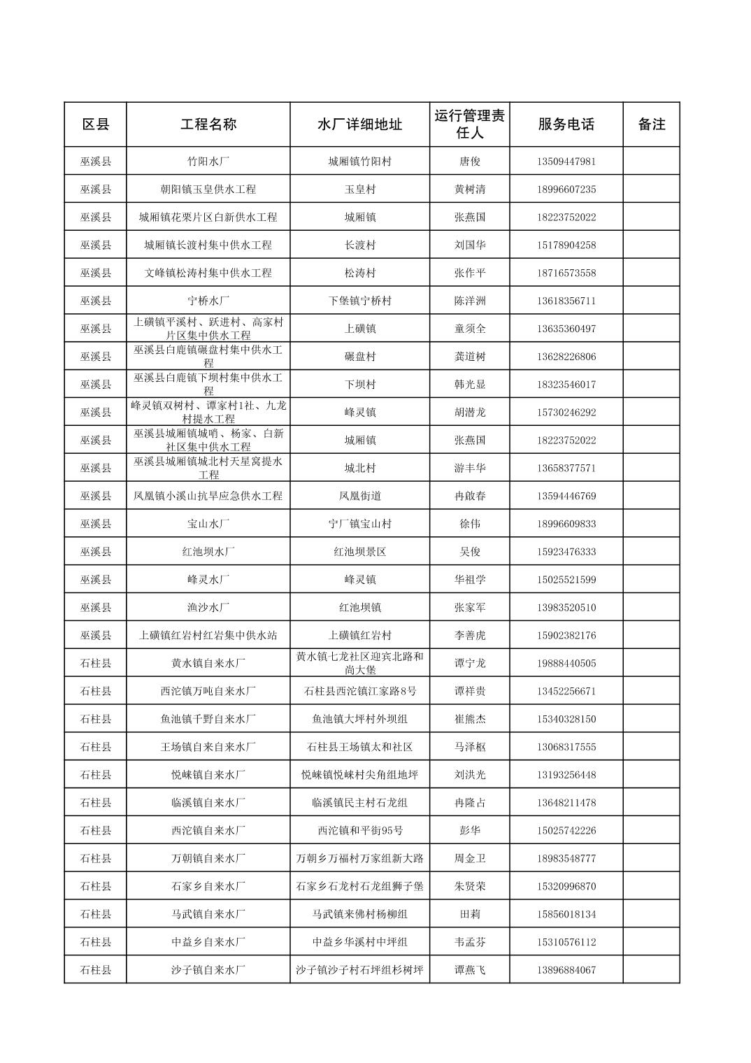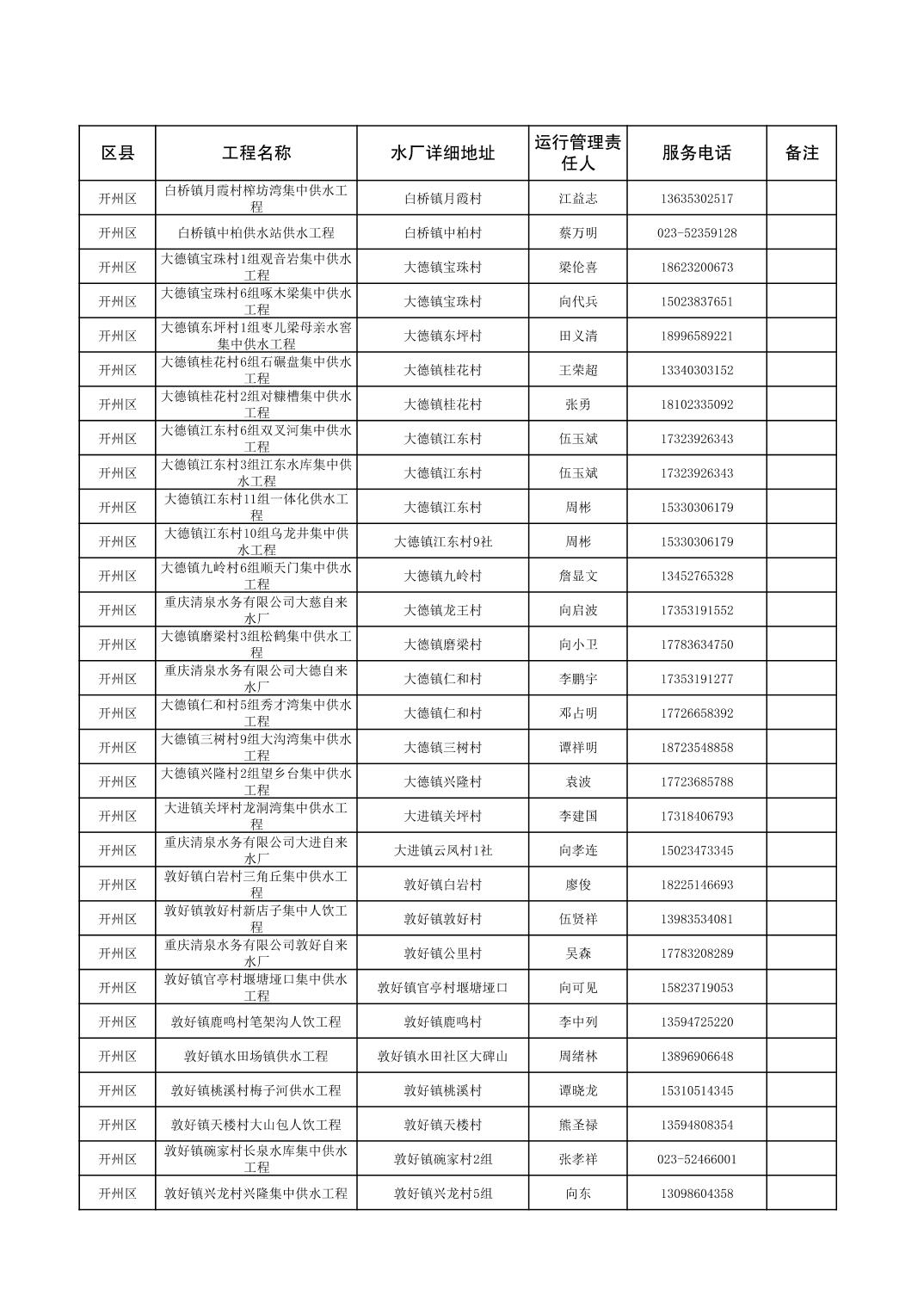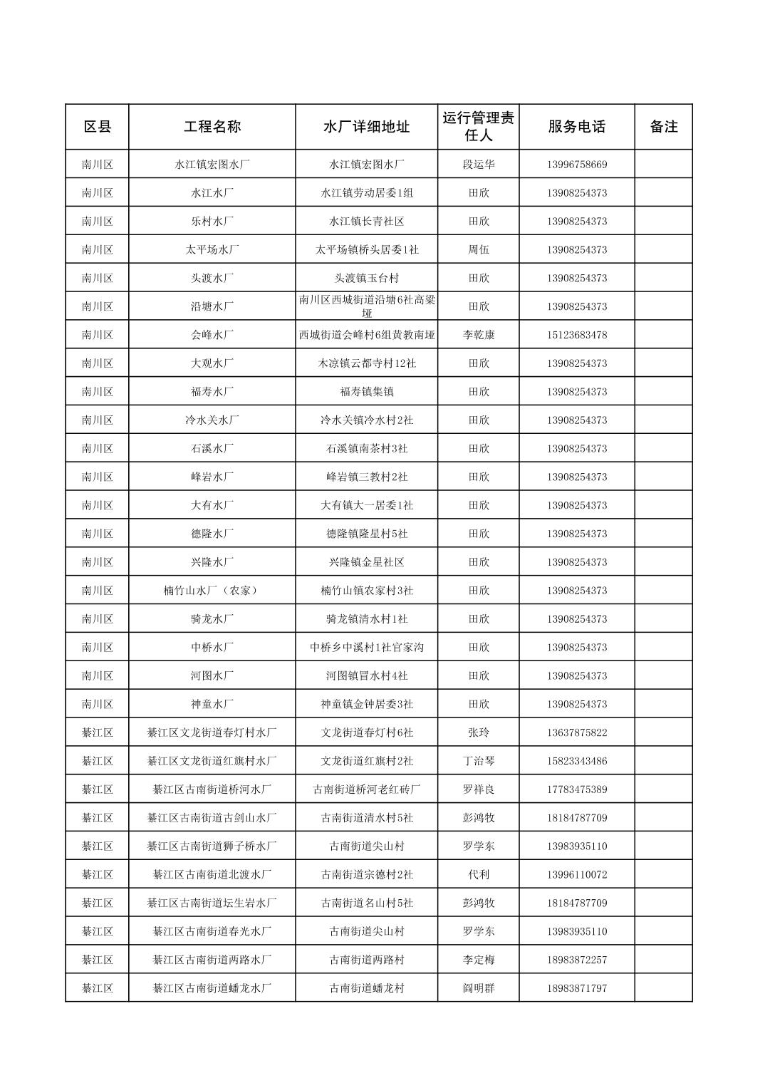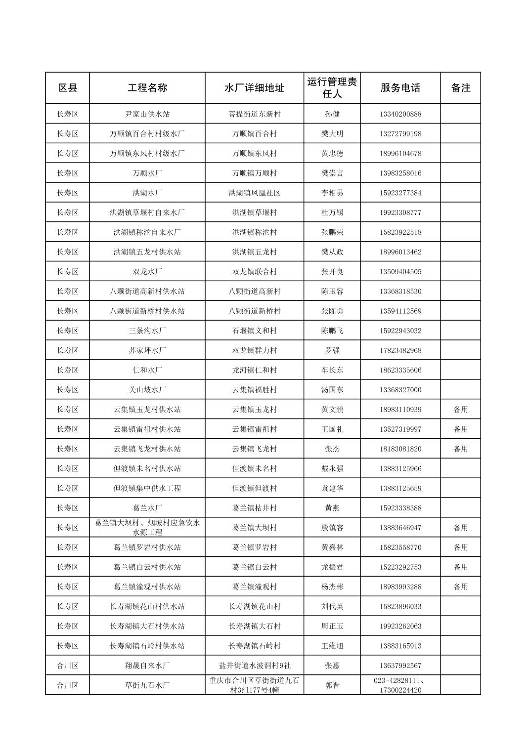 重庆市千人以上农村供水工程运行管理责任人及服务电话