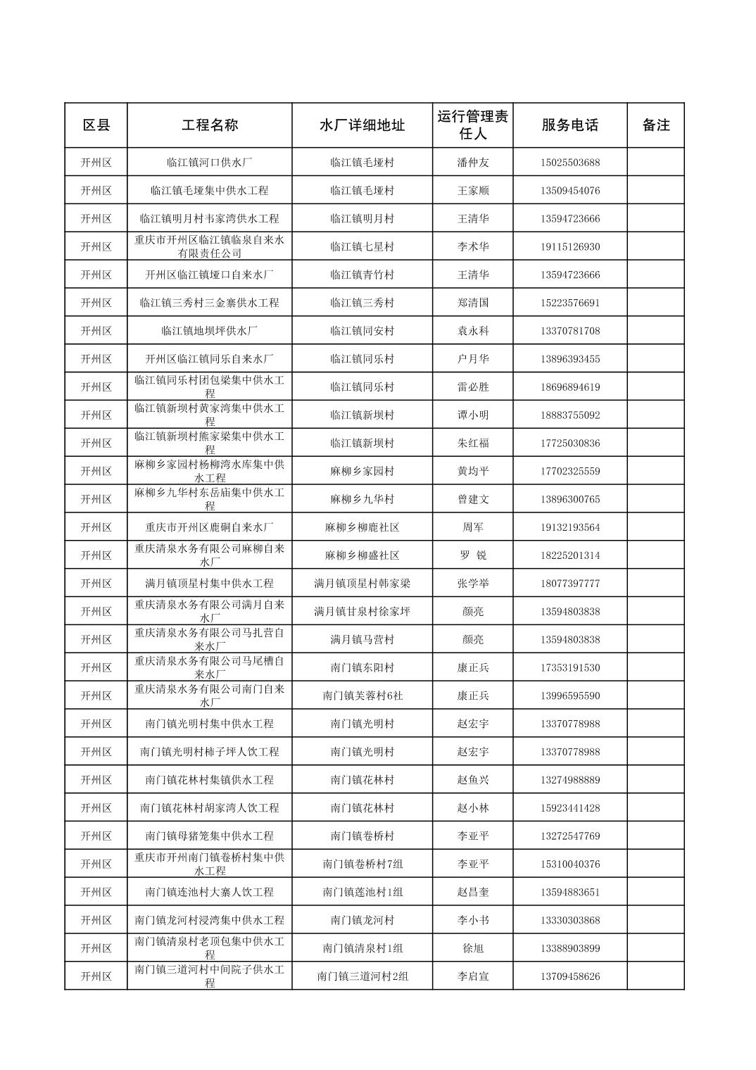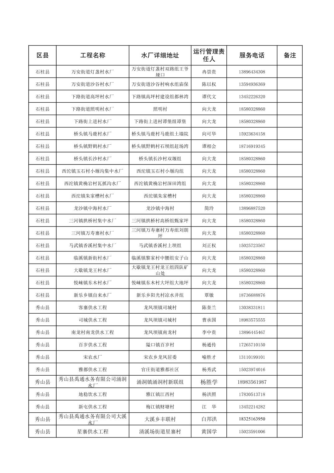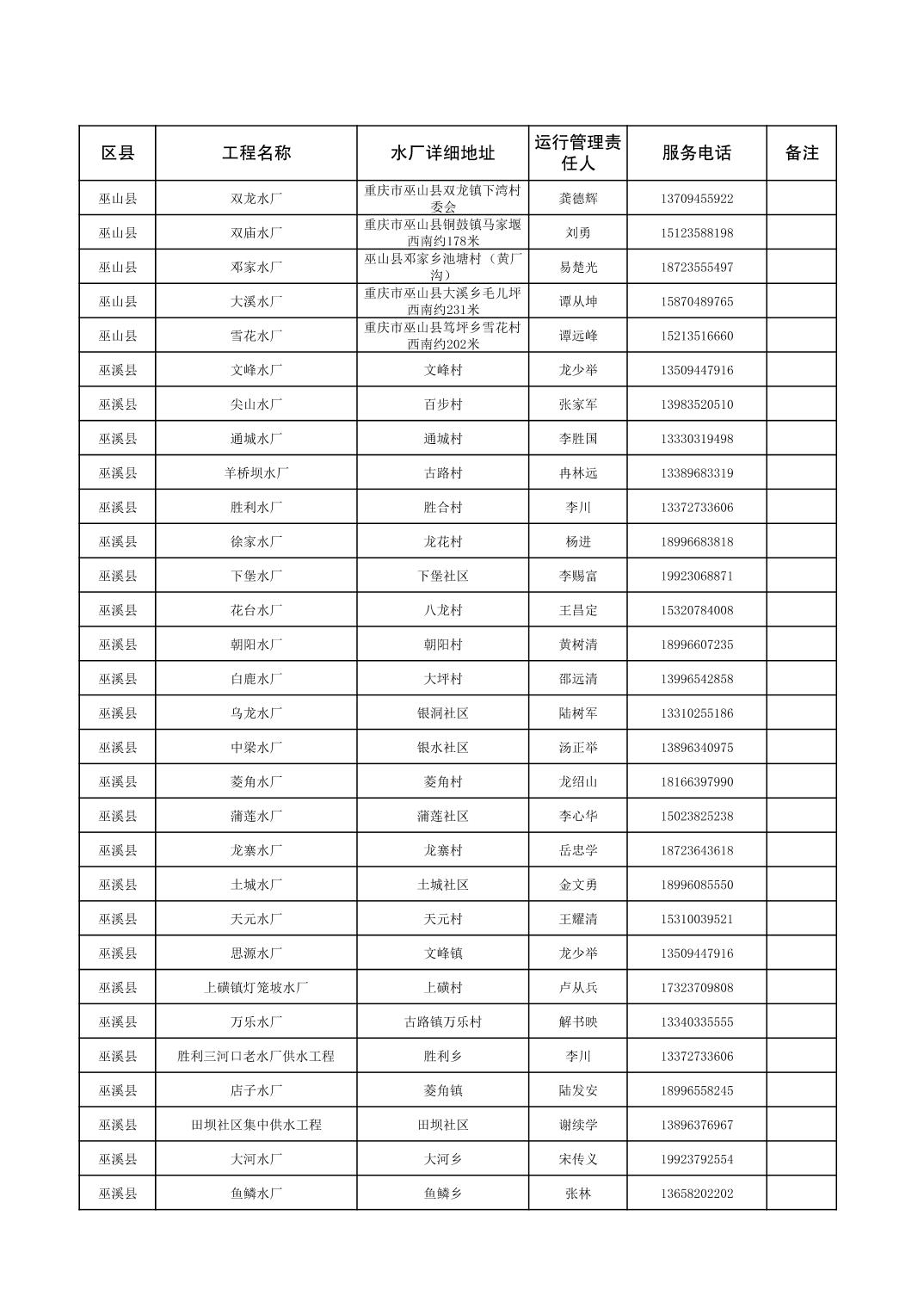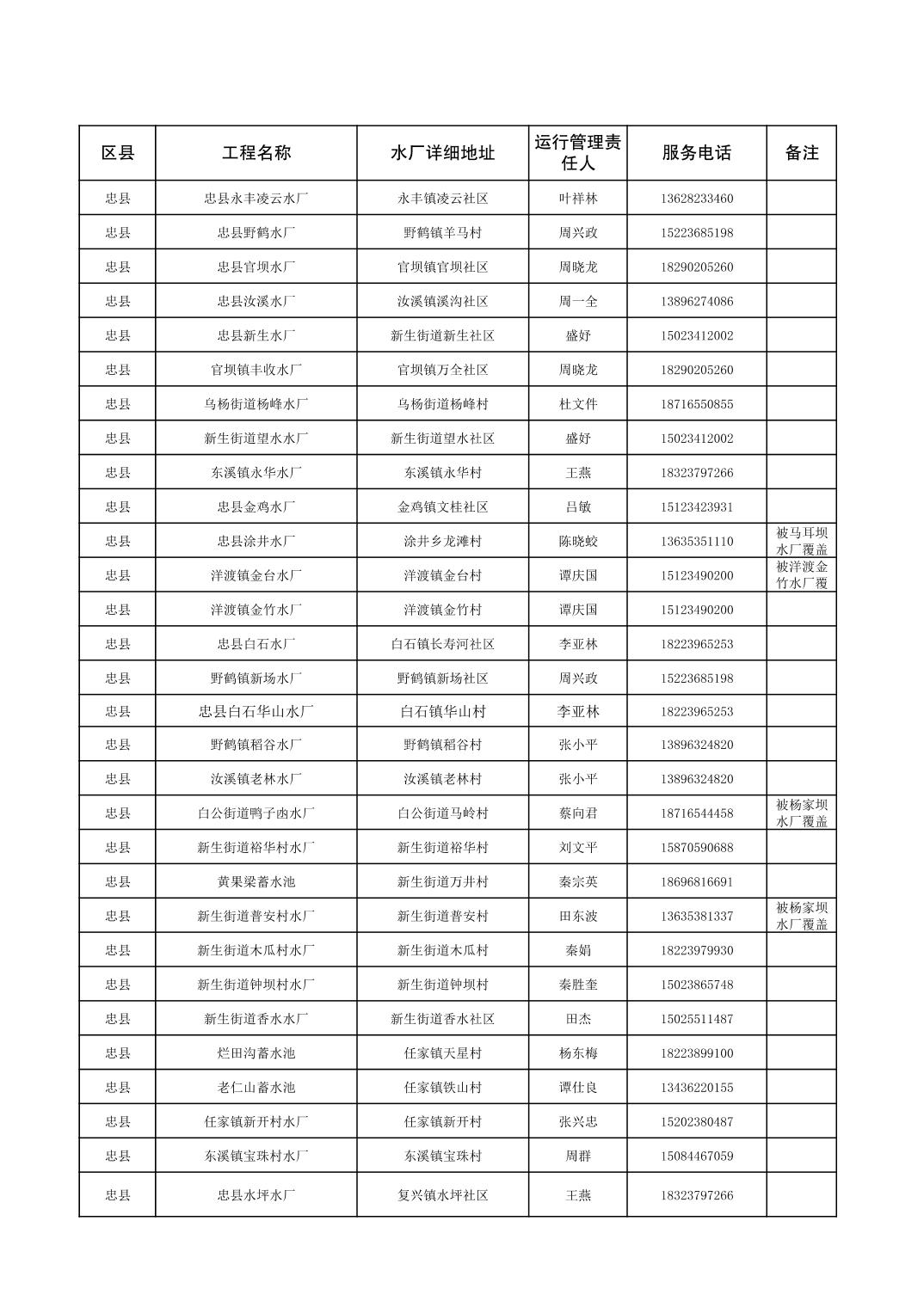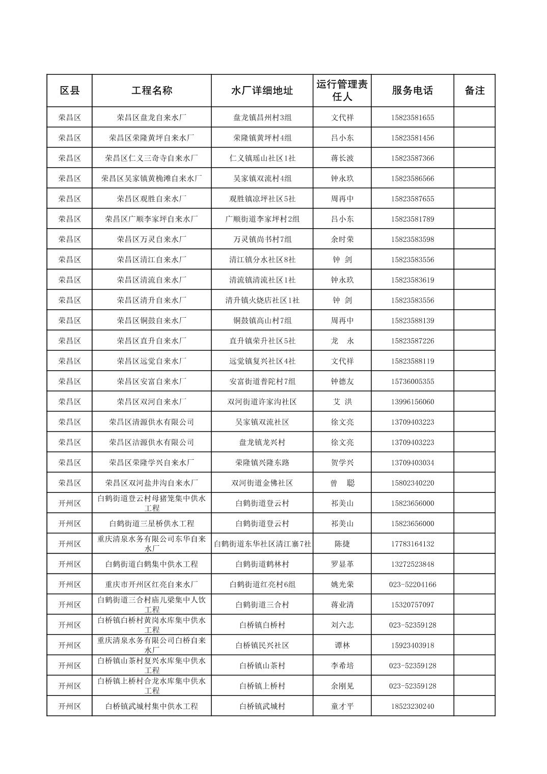 重庆市千人以上农村供水工程运行管理责任人及服务电话