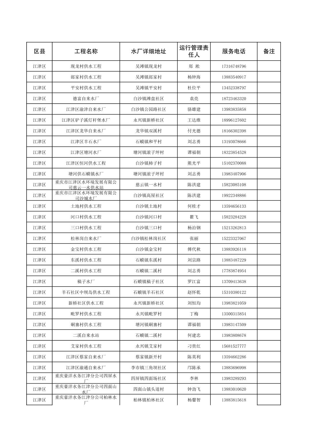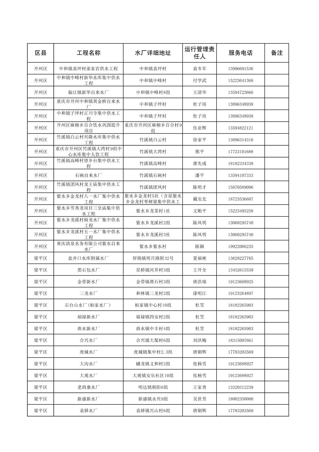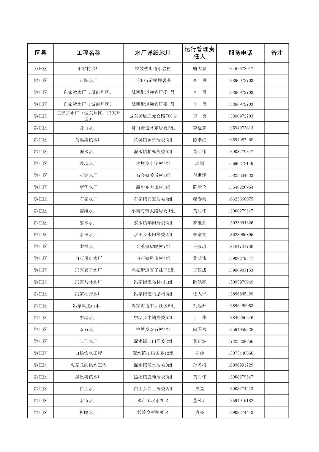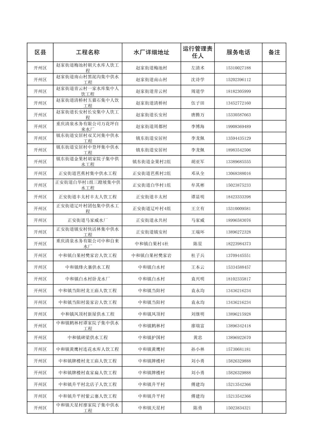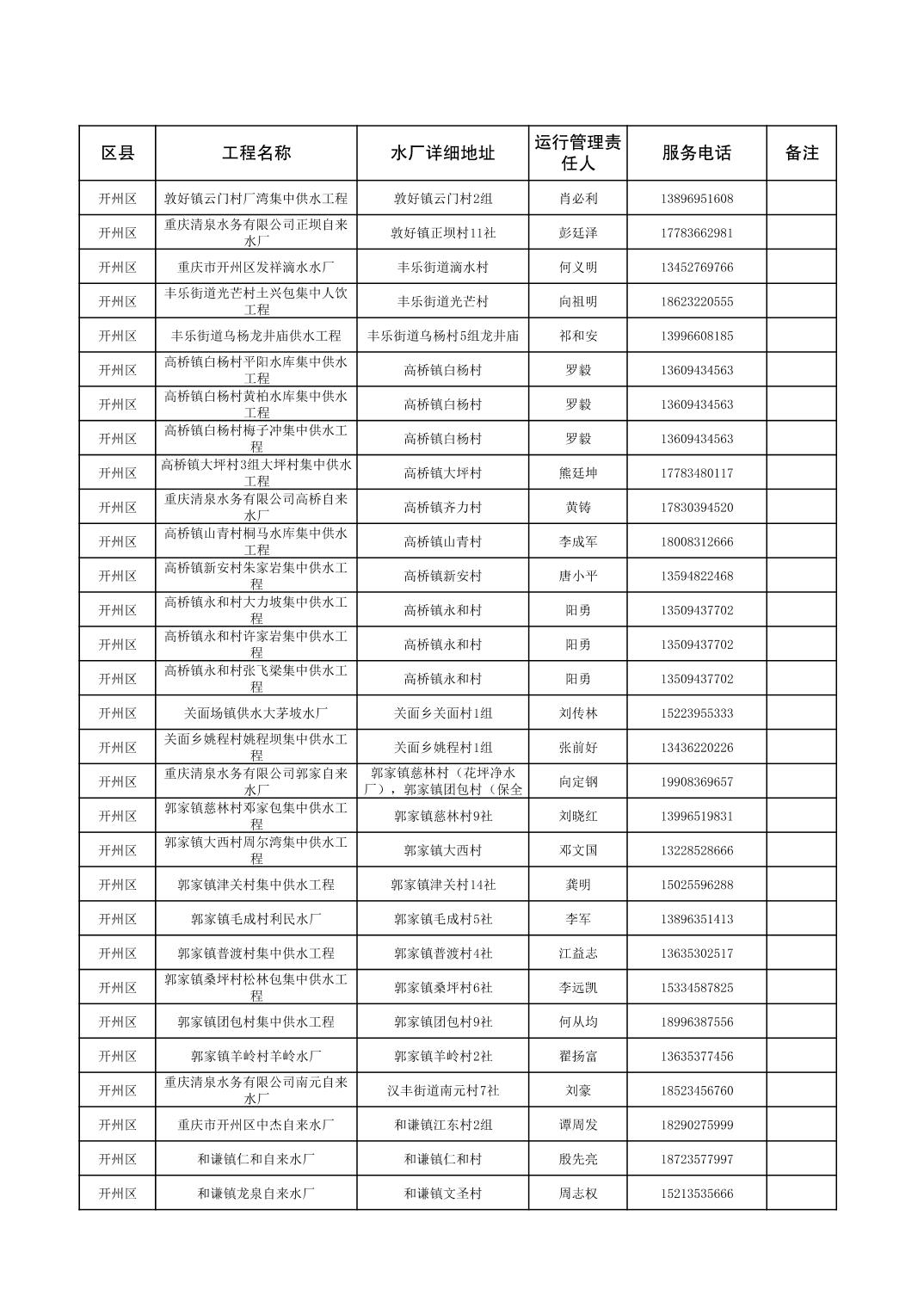重庆市千人以上农村供水工程运行管理责任人及服务电话