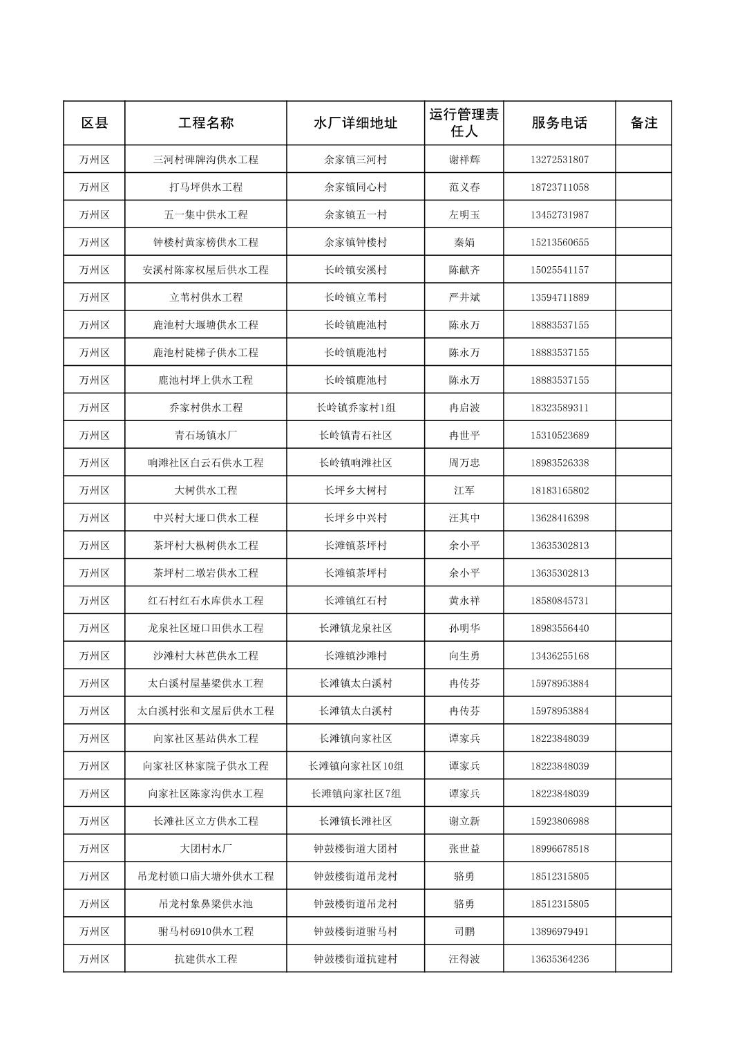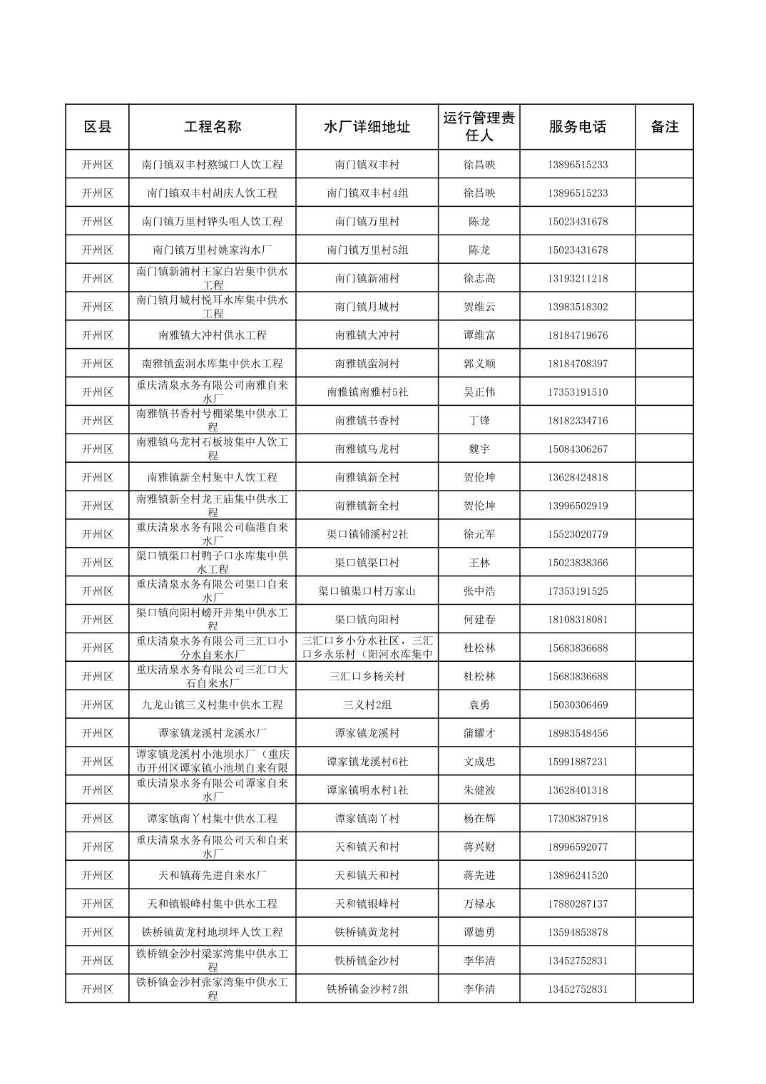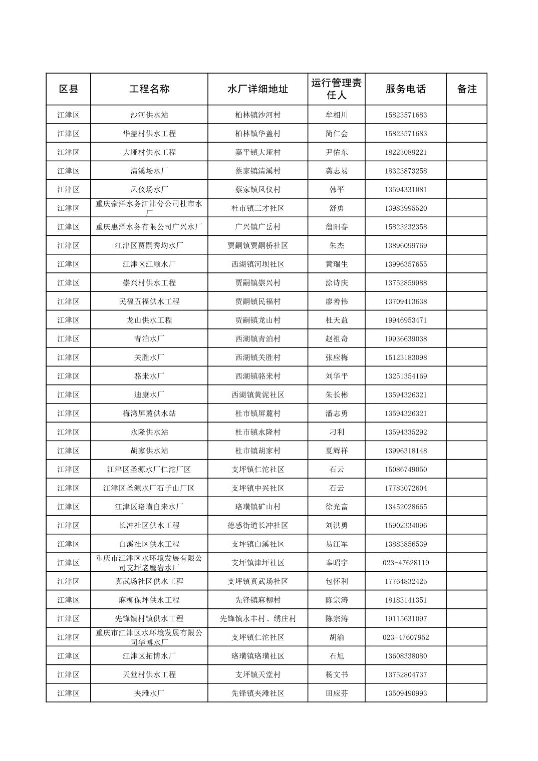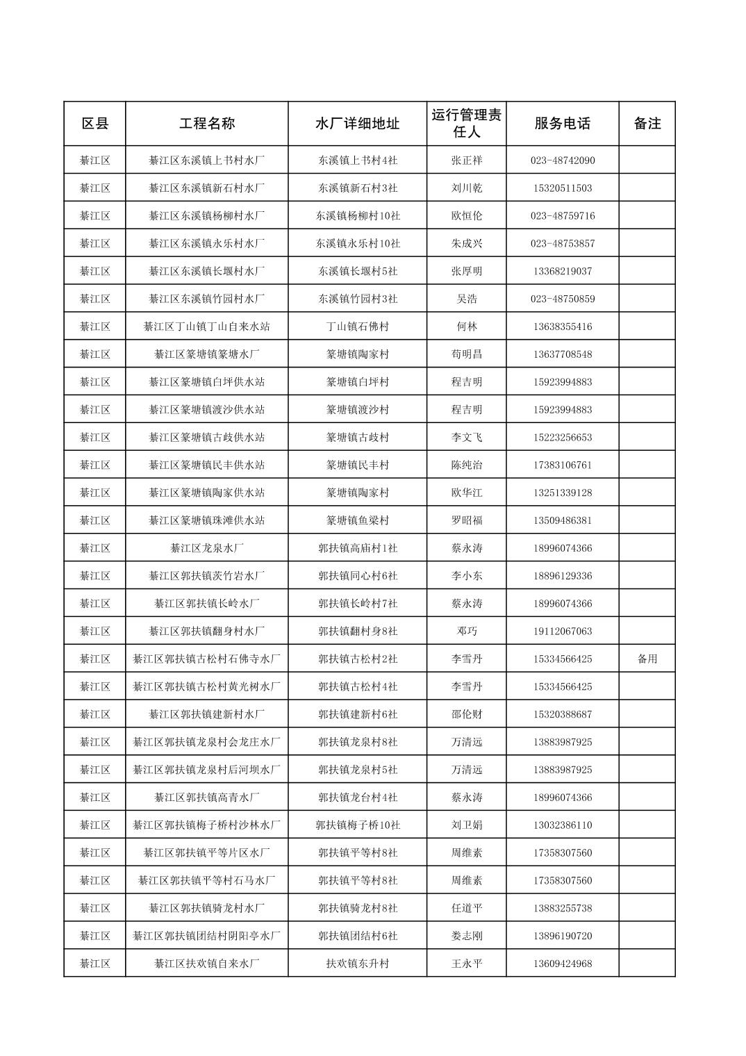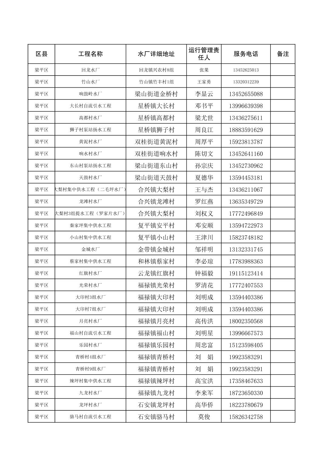 重庆市千人以上农村供水工程运行管理责任人及服务电话