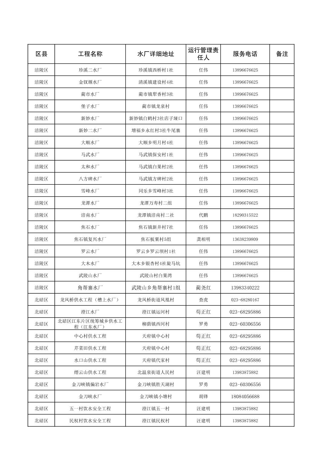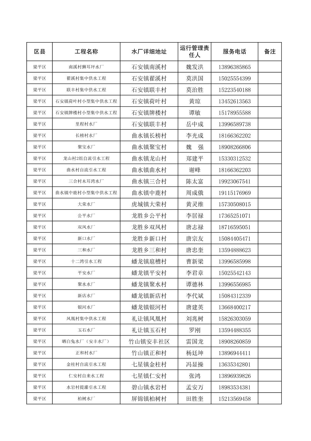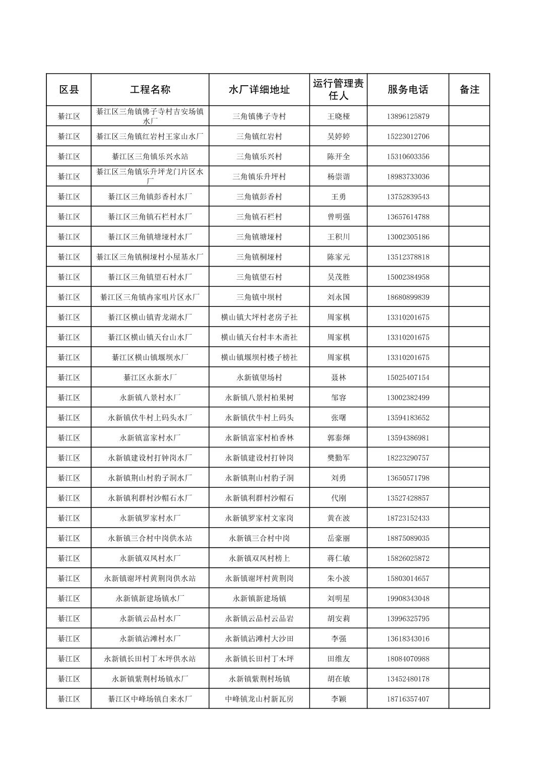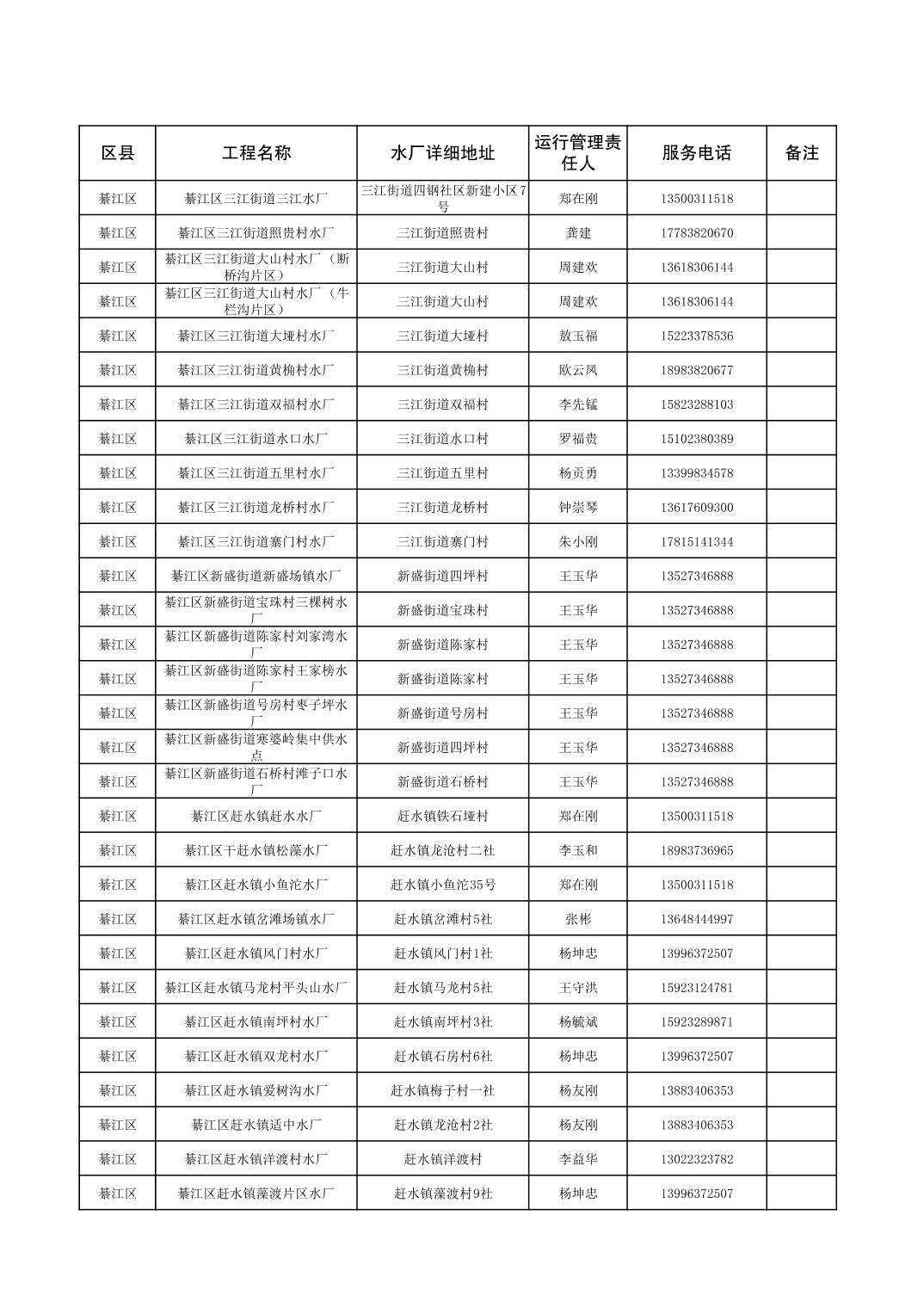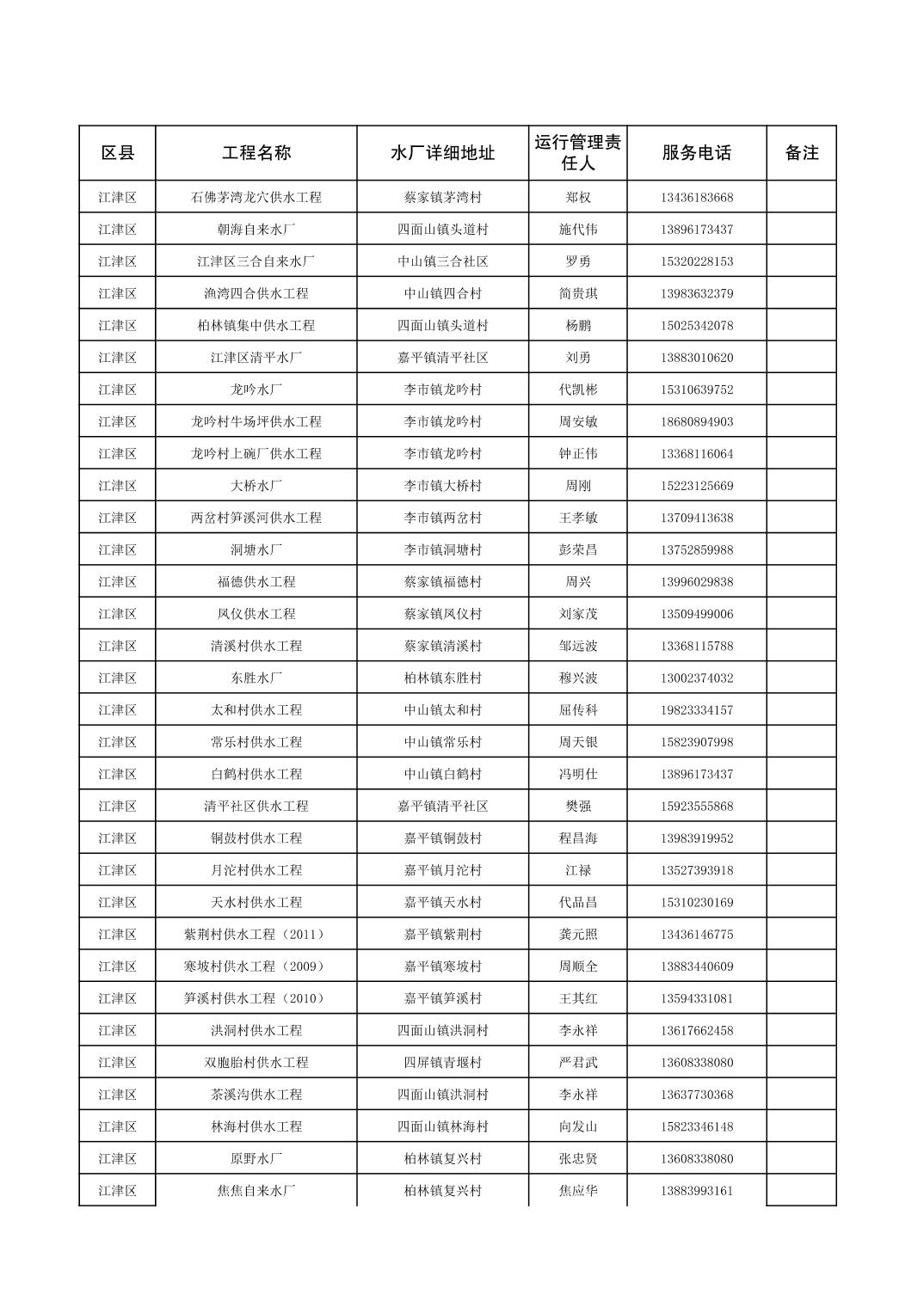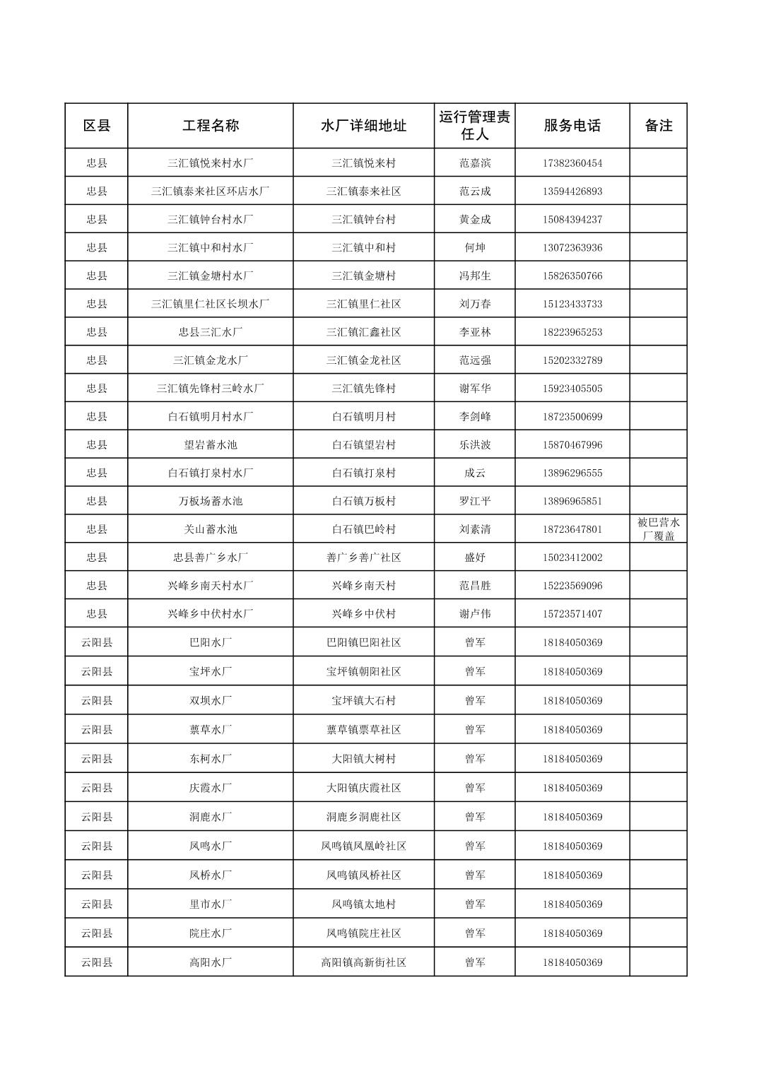 重庆市千人以上农村供水工程运行管理责任人及服务电话