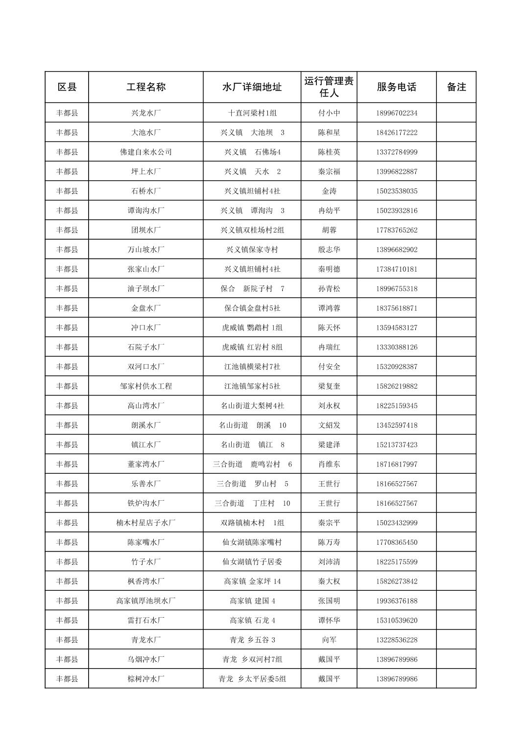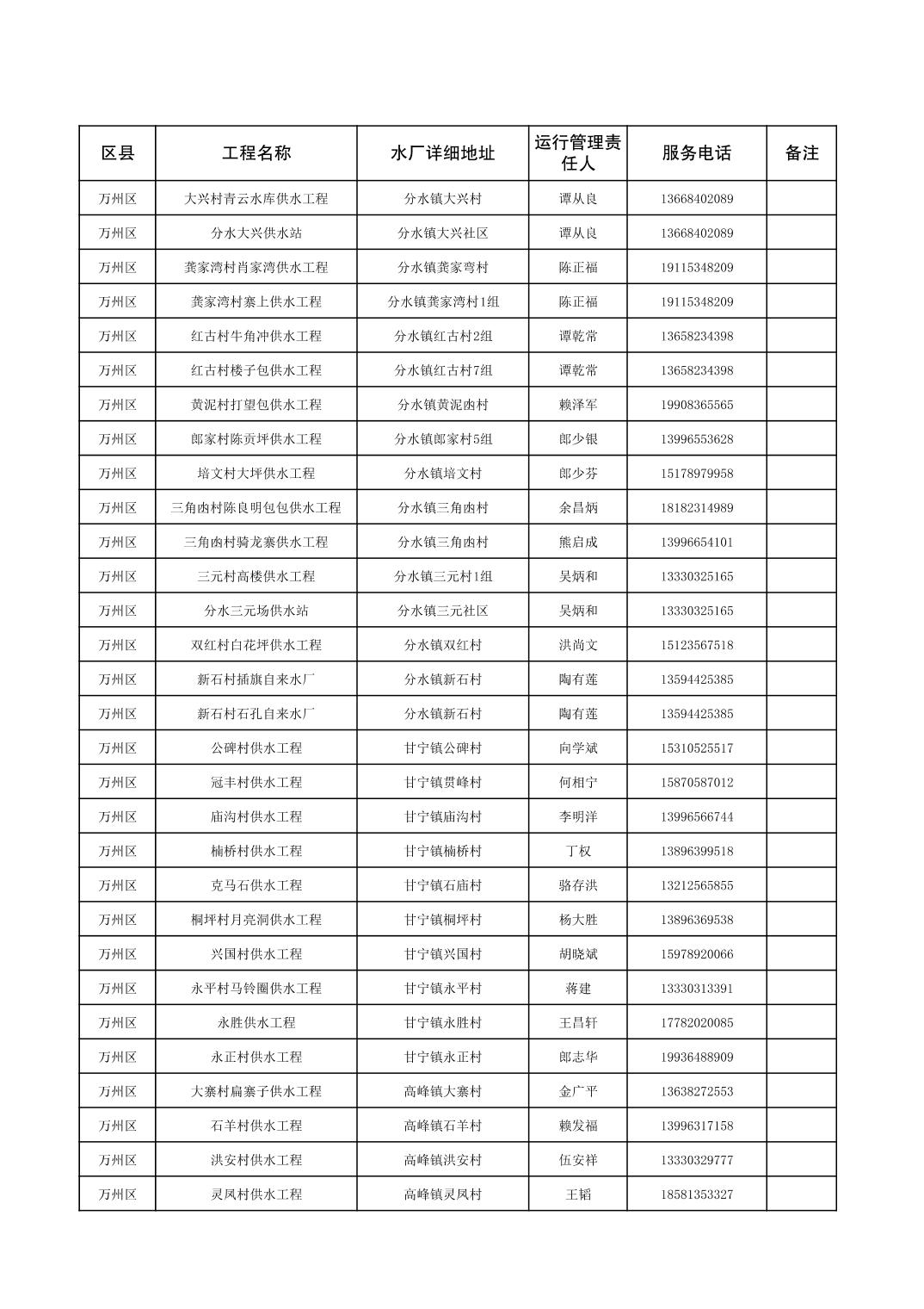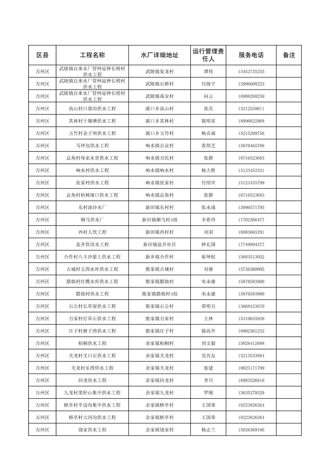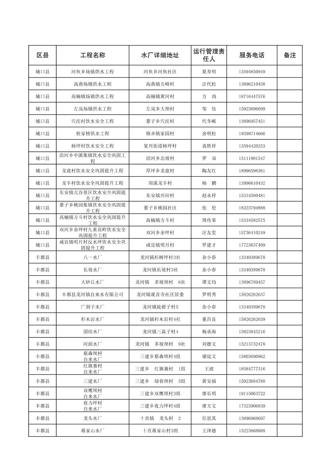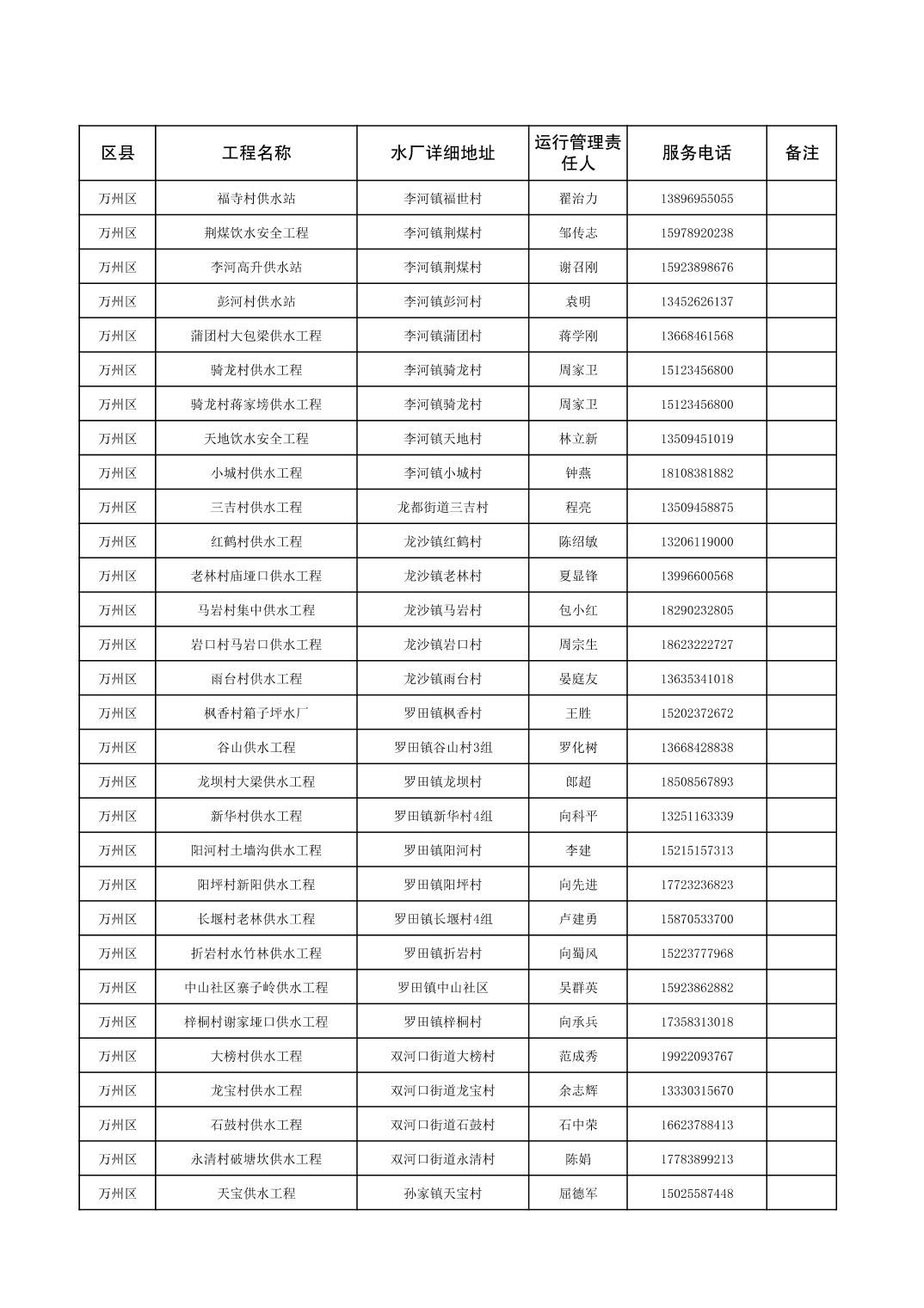 重庆市千人以上农村供水工程运行管理责任人及服务电话