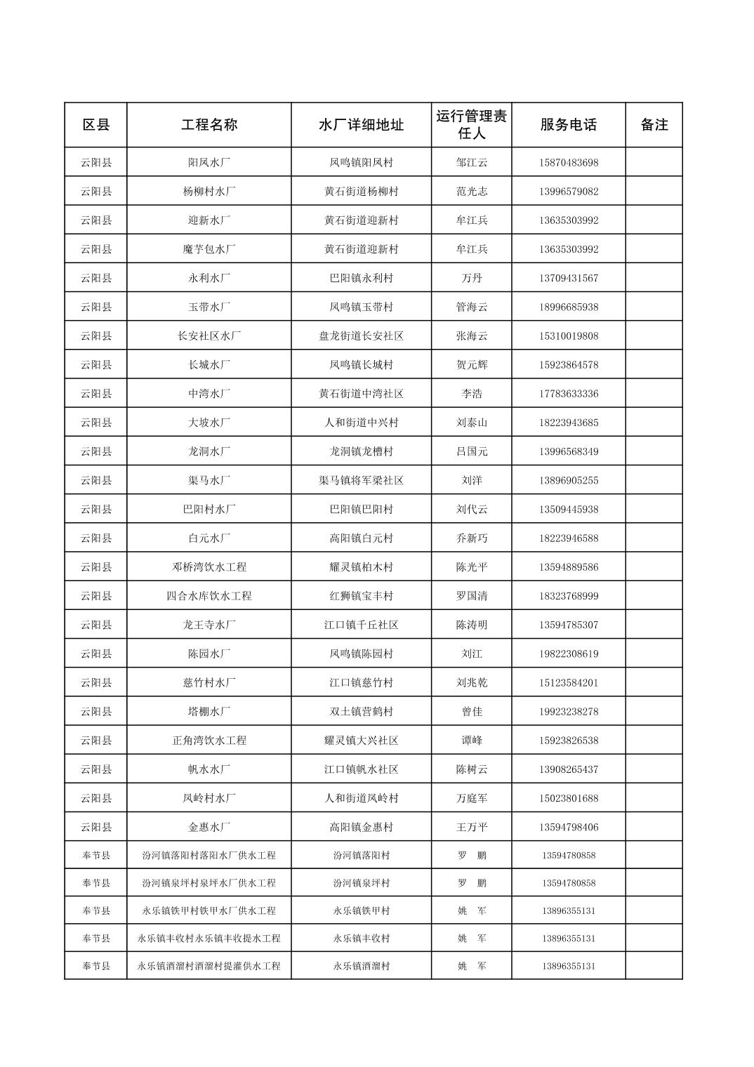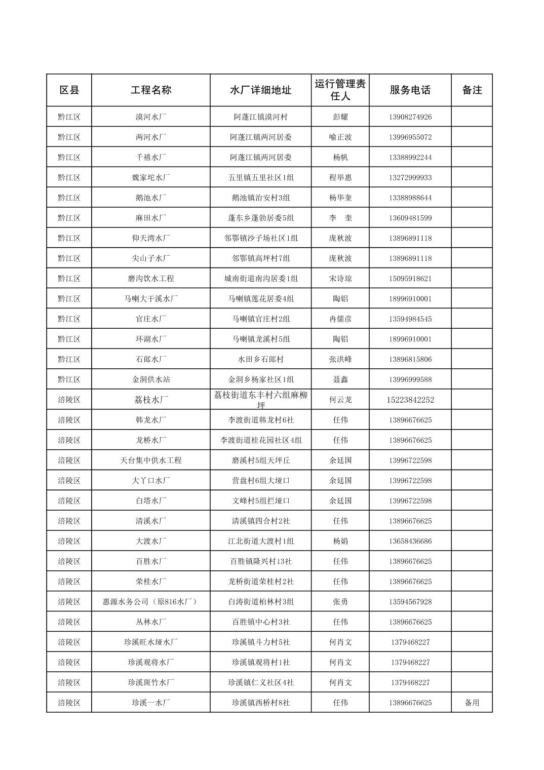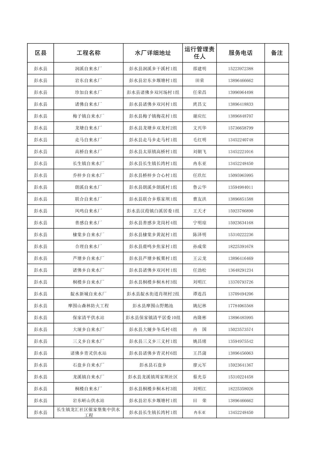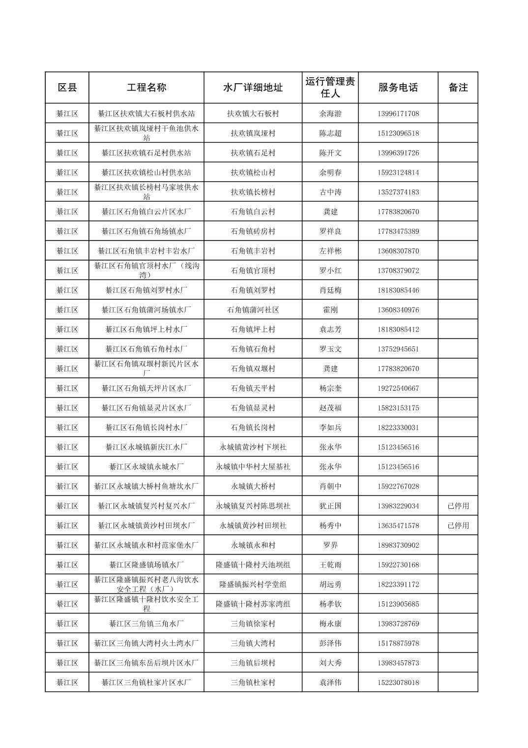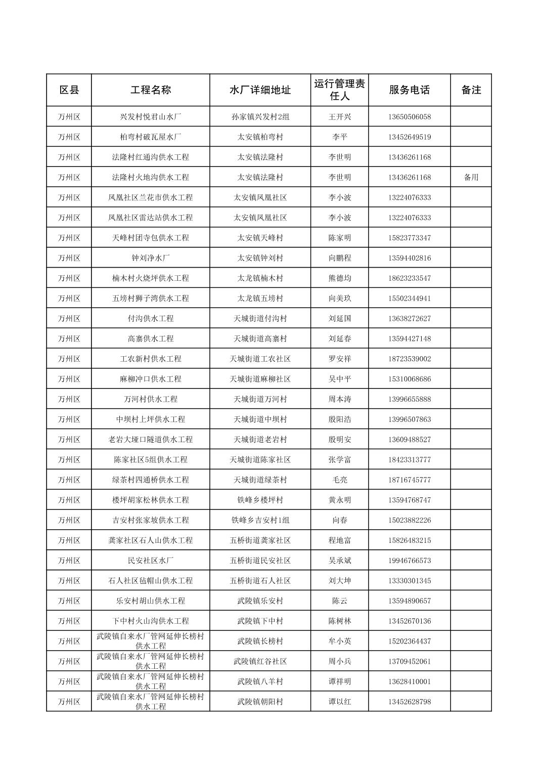 重庆市千人以上农村供水工程运行管理责任人及服务电话