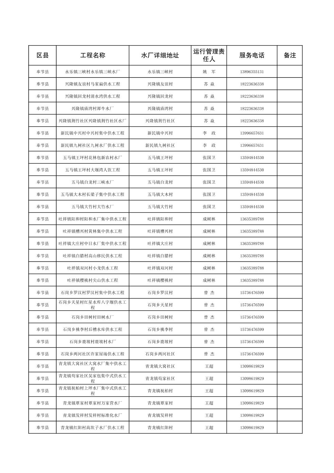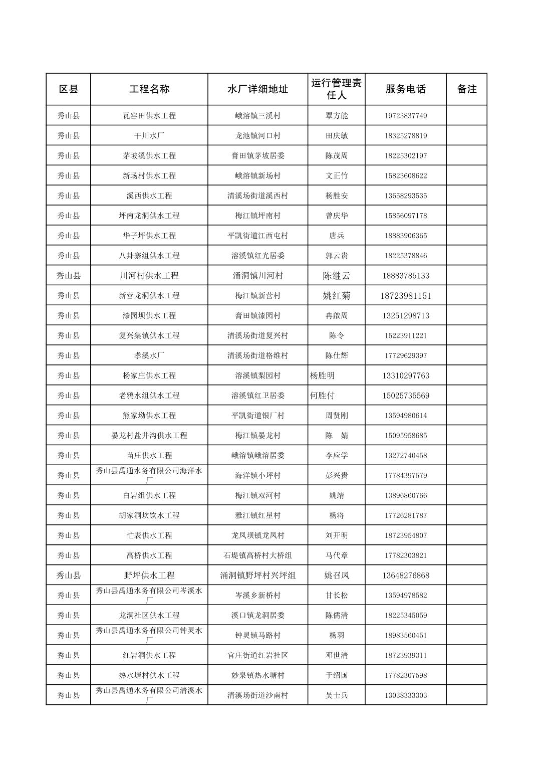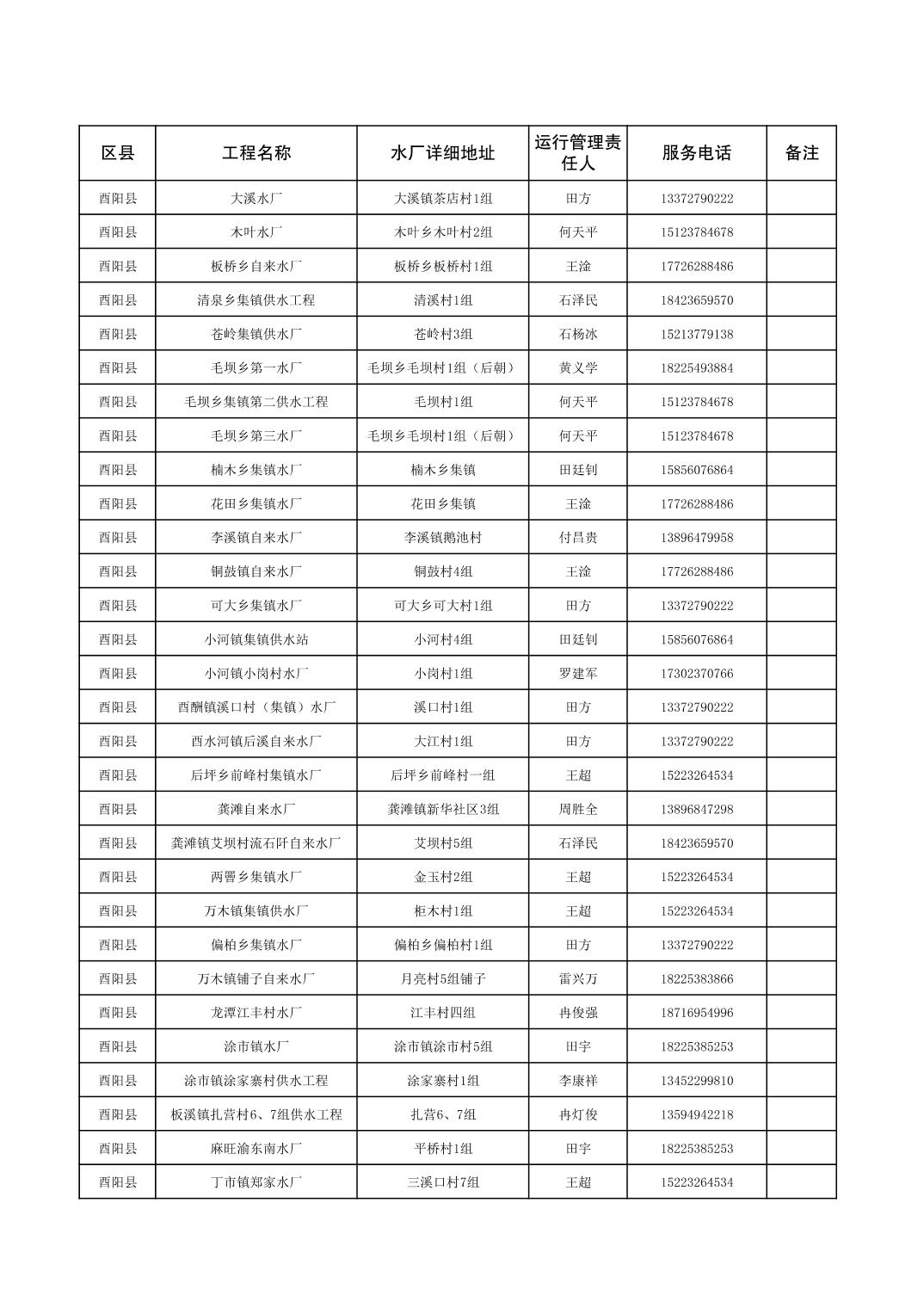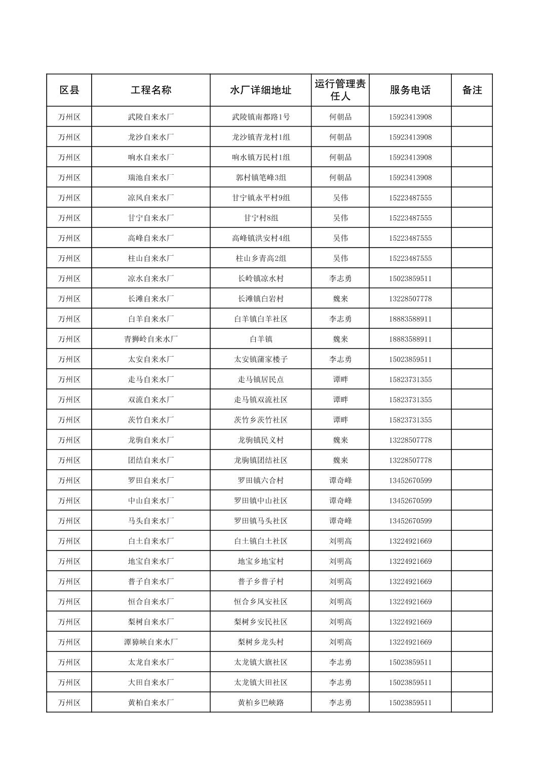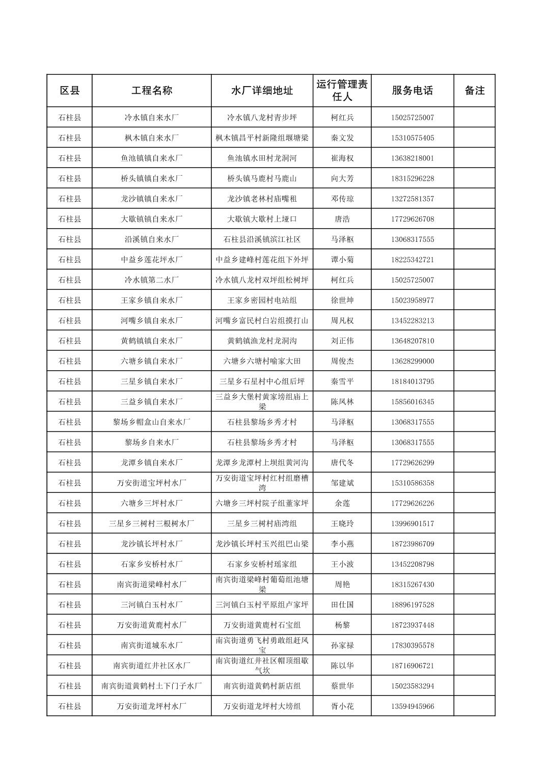 重庆市千人以上农村供水工程运行管理责任人及服务电话