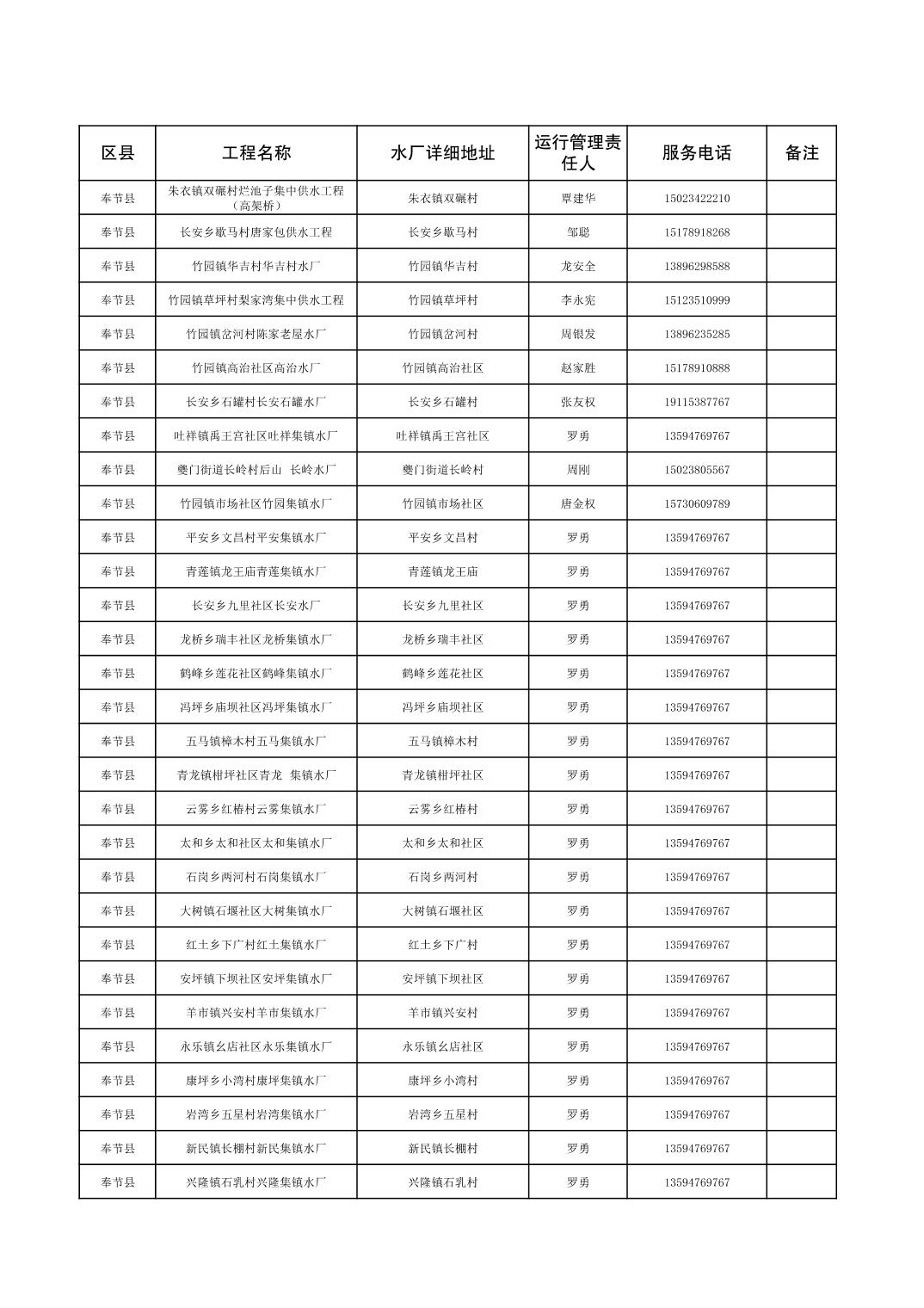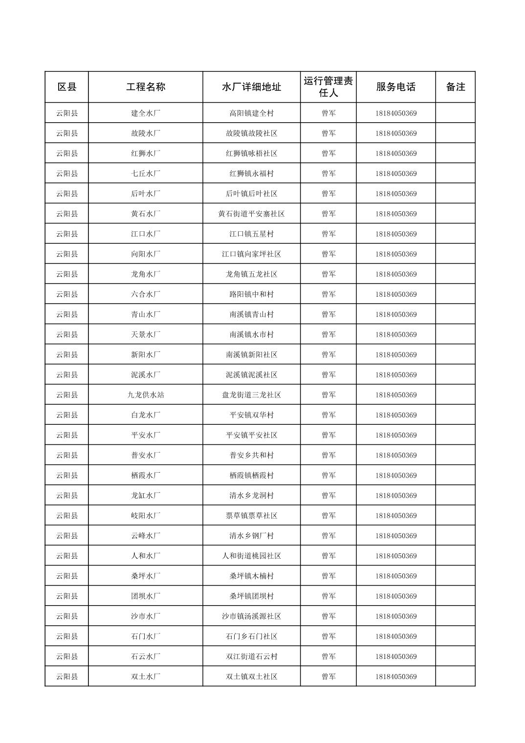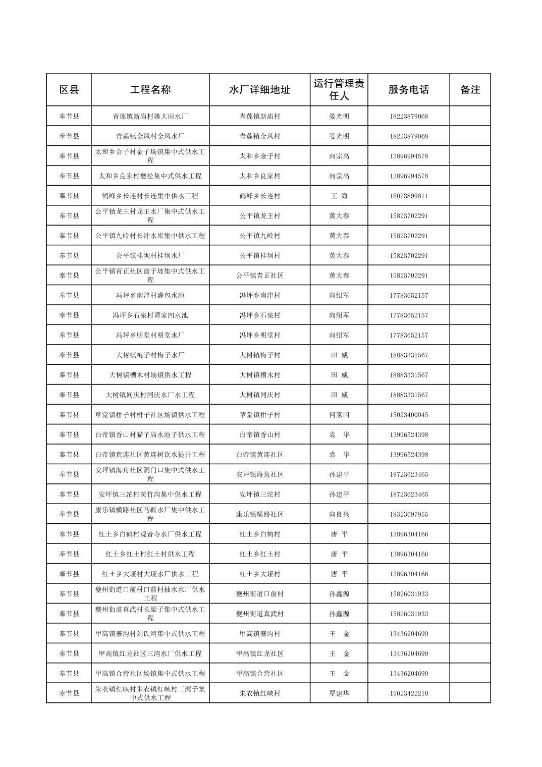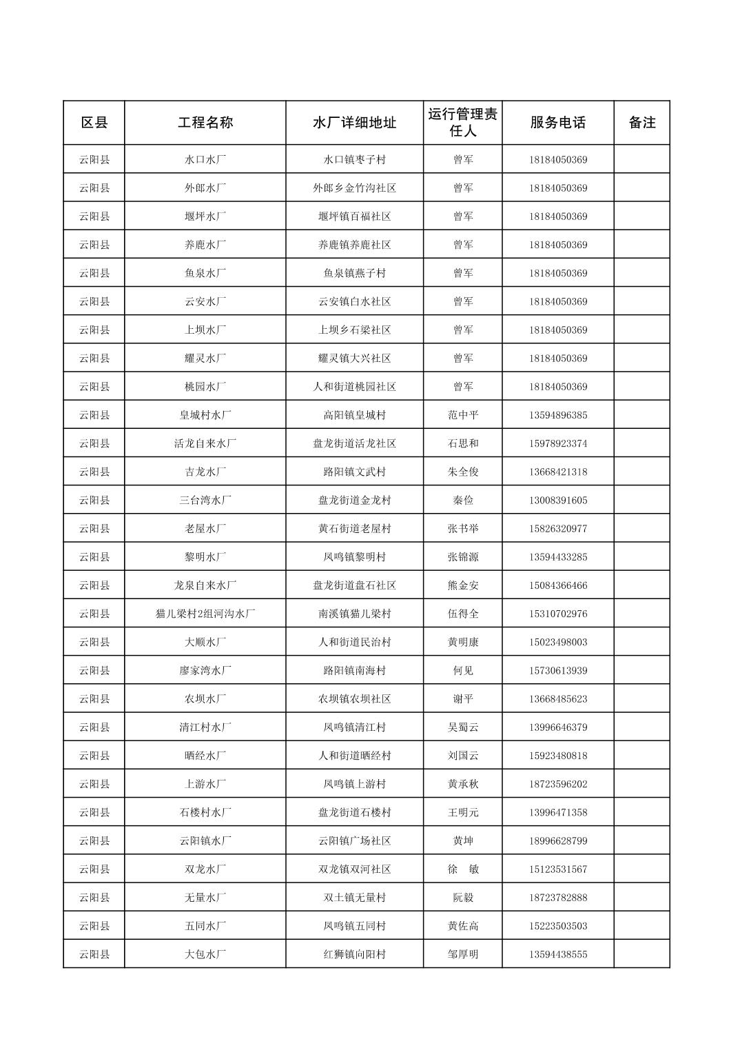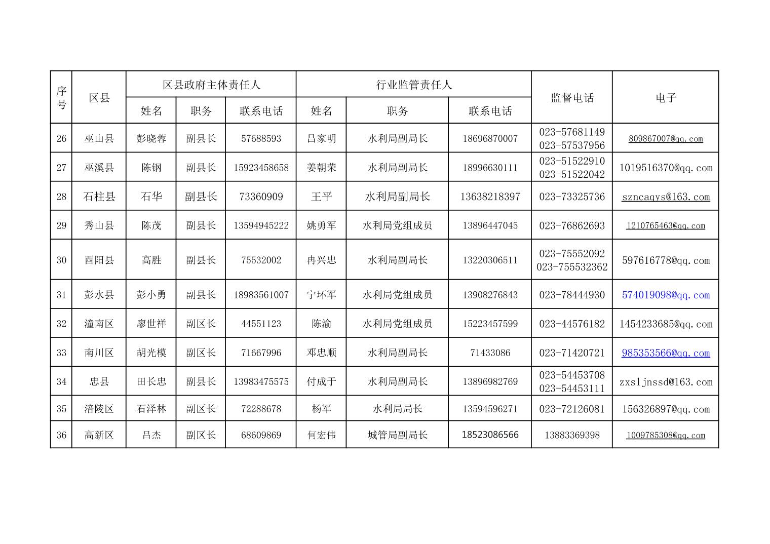 重庆市千人以上农村供水工程运行管理责任人及服务电话
