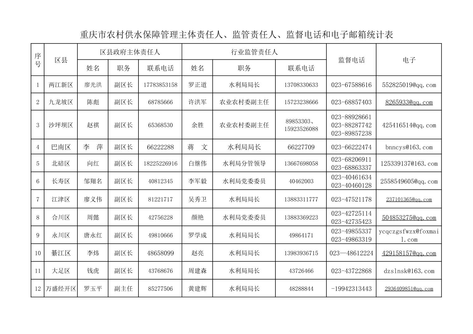 附件下载:重庆市农村供水保障管理主体责任人、监管责任人、监督电话和电子邮箱统计表.xls