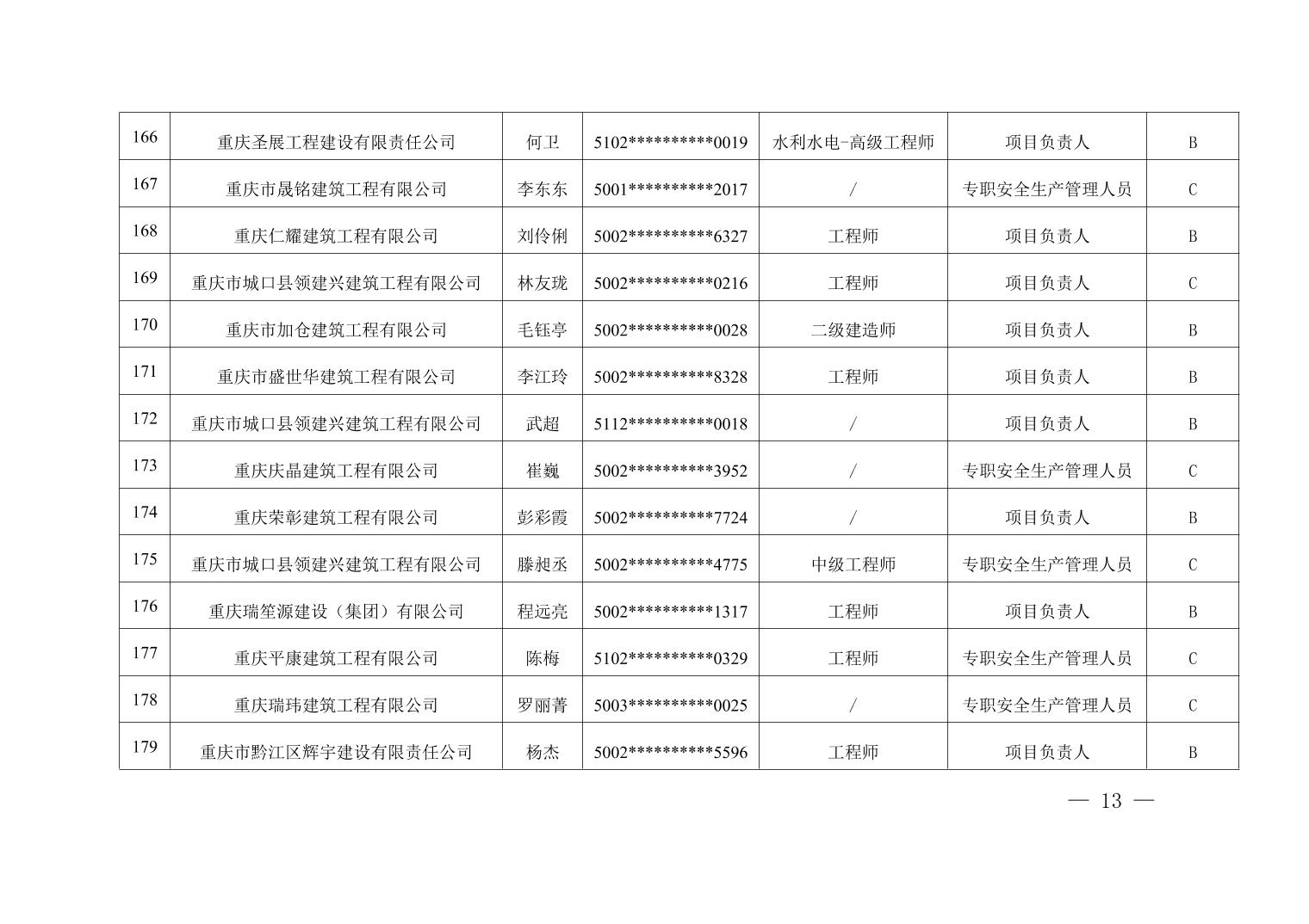 根据《建设工程安全生产管理条例》(国务院令第393号)、《安全生产许可证条例》(国务院令第397号)、《水利工程建设生产管理规定》(水利部令26号)、《水利部关于修订印发〈水利水电工程施工企业主要负责人、项目负责人和专职安全生产管理人员安全生产考核管理办法〉的通知》(水监督〔2022326号)的规定,重庆市水利局于202512月组织开展了全市水利水电工程施工企业主要负责人、项目负责人和专职安全生产管理人员(以下简称“安管人员”)第四期安全生产考核管理工作。经公示期满后,现将2025年度第期水利水电工程施工企业“安管人员”新申领考核合格人员名单(238人)和申请延续考核合格人员名单(64)予以公布(详见附件12)。