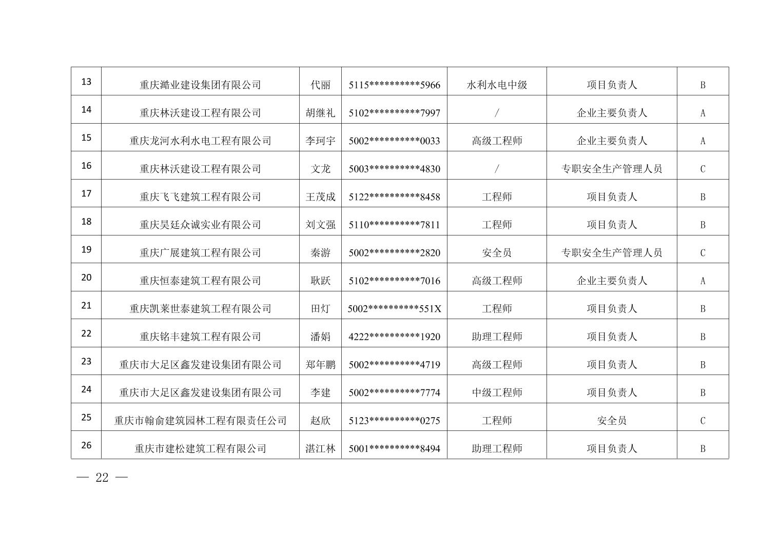 全文下载:重庆市水利局办公室关于公布2025年度第四期水利水电工程施工企业主要负责人、项目负责人和专职安全生产管理人员安全生产考核管理合格人员名单的通知.doc
