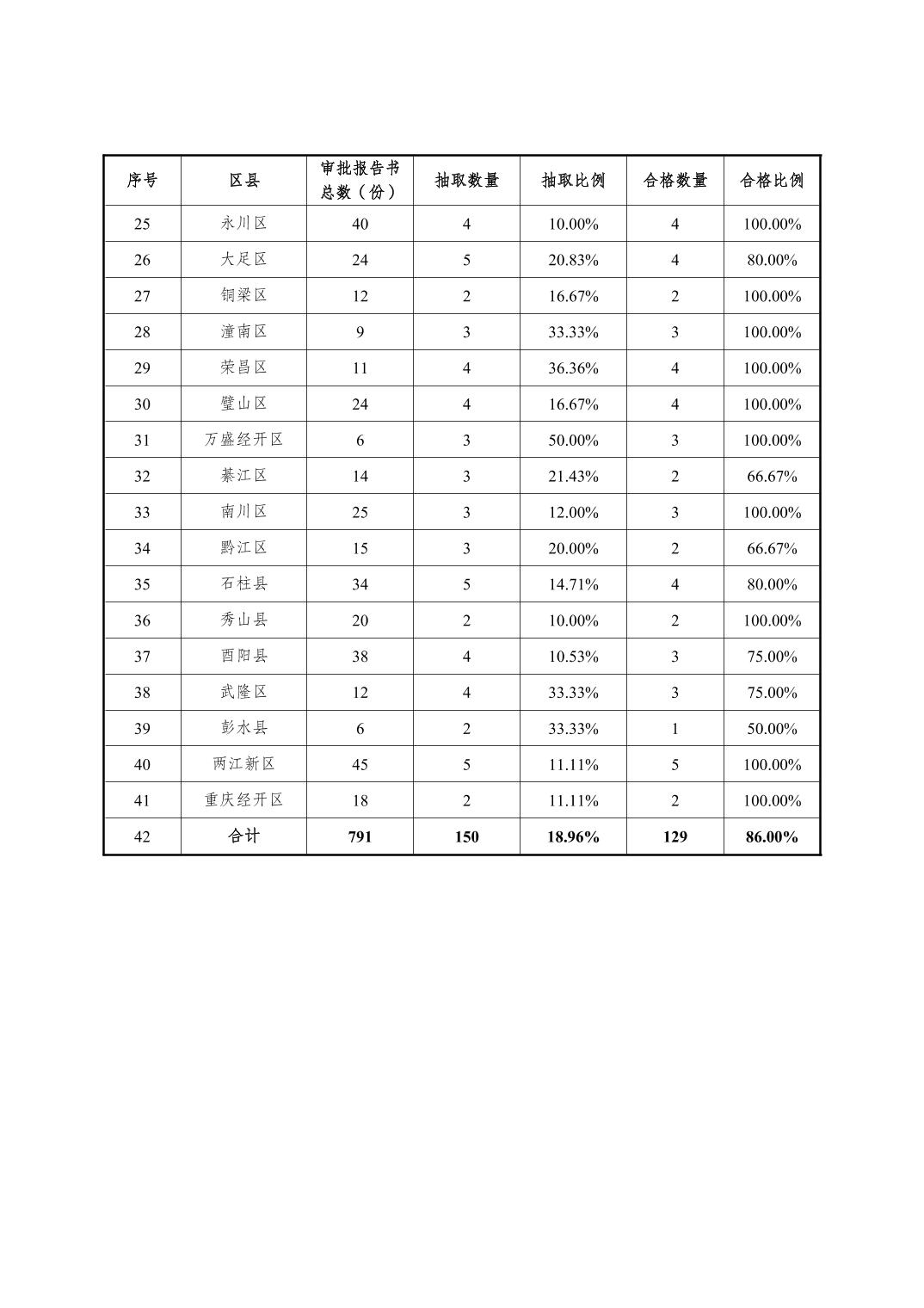 (三)区县审批质量。渝北、涪陵、巴南等27个区县抽查的方案报告书质量好,质量合格率达100%;梁平、奉节、开州、巫山、彭水共5个区县抽查的方案报告书质量差,质量合格率低于60%,详见附件2。