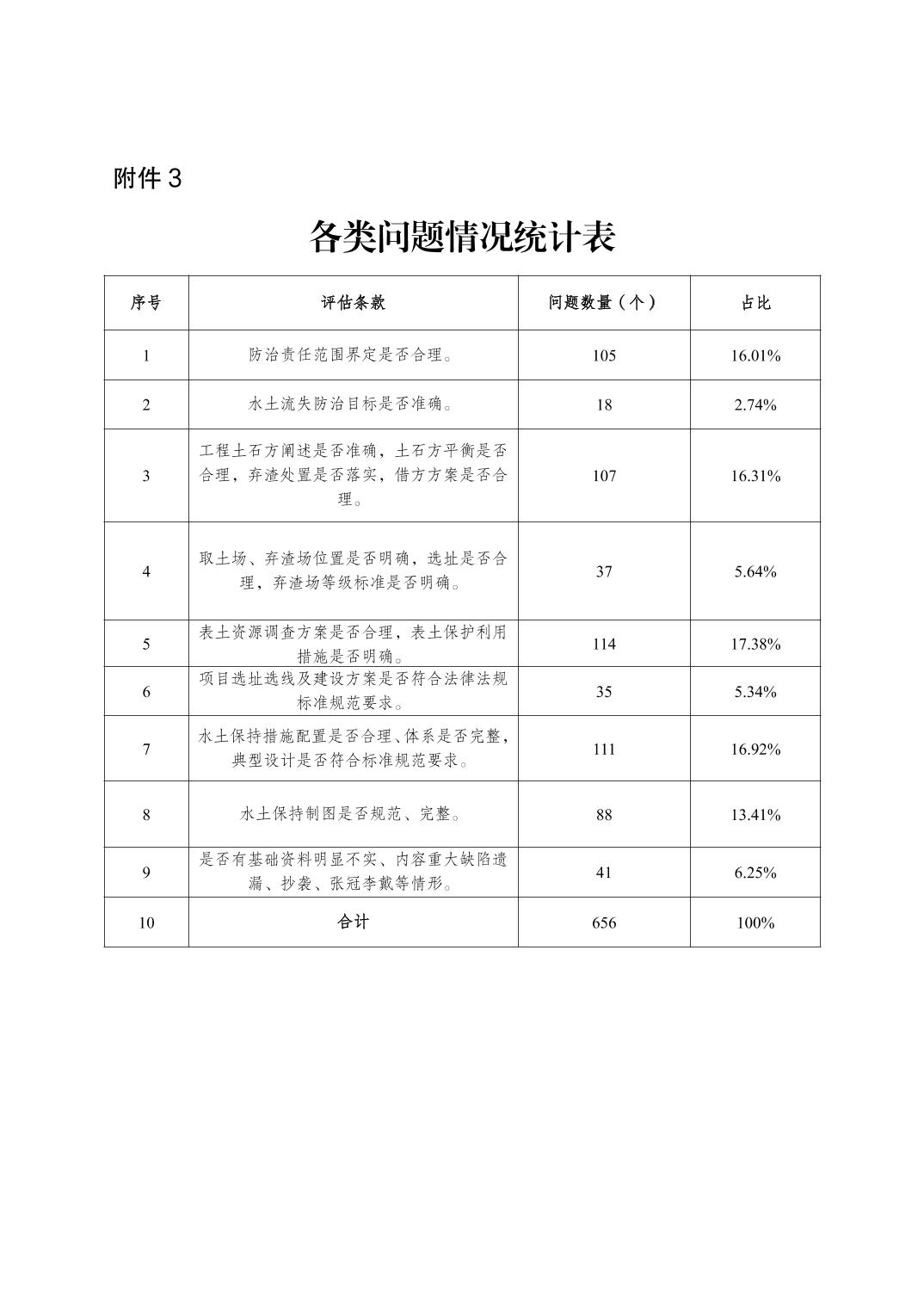 (一)技术问题占比高。本次抽查的150份区县审批的水土保持方案报告书存在9个方面656个问题,其中:表土资源(问题数量114个,占问题总数的17.38%)、项目选址选线及建设方案(问题数量111个,占问题总数的16.92%)、项目土石方(问题数量107个,占问题总数的16.31%)及项目防治责任范围(问题105个,占问题总数的16.01%)四个关键技术问题占发现问题总数量的66.62%(见附件3)。