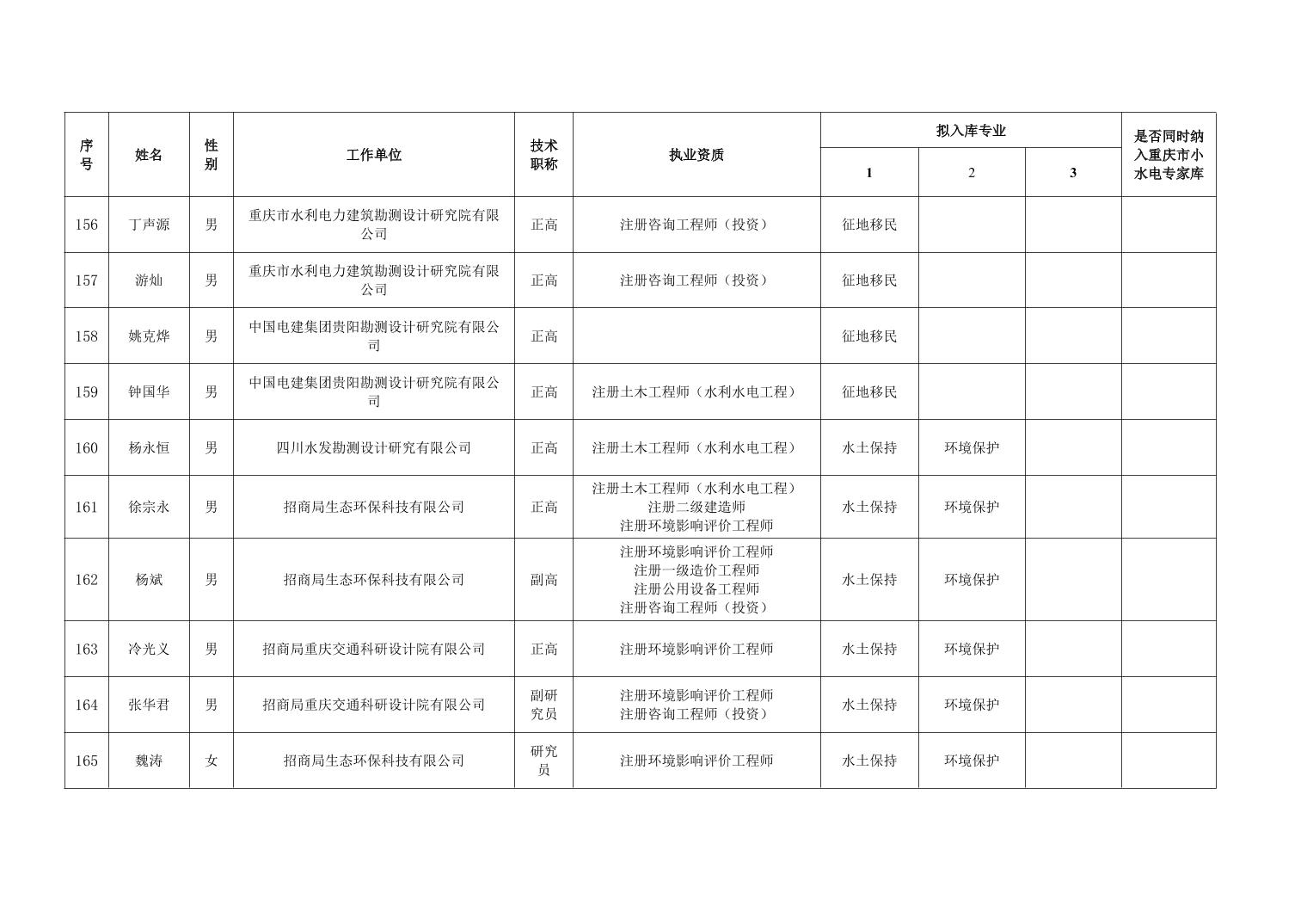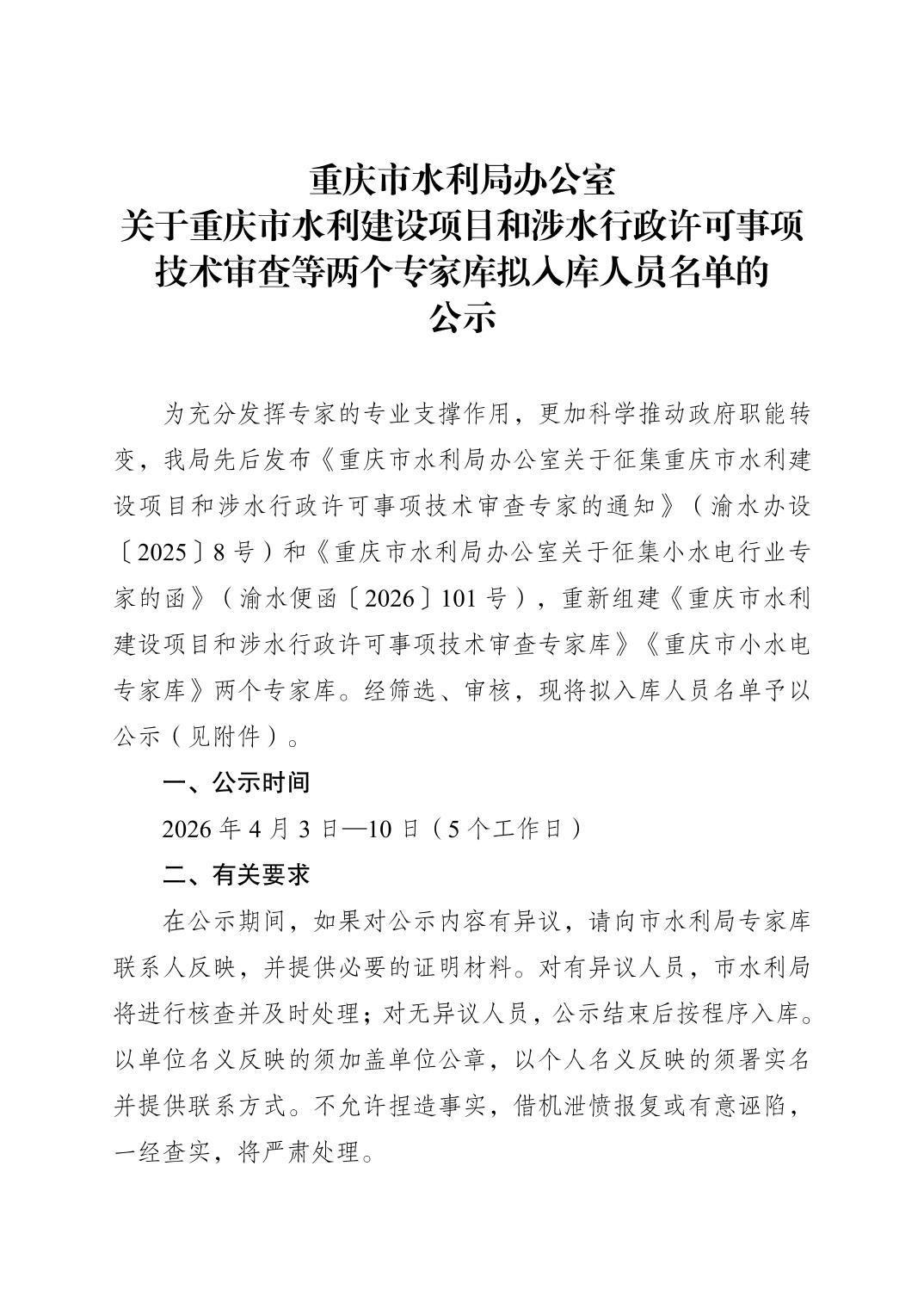 全文下载:重庆市水利局办公室关于重庆市水利建设项目和涉水行政许可事项技术审查等两个专家库拟入库人员名单的公示.doc