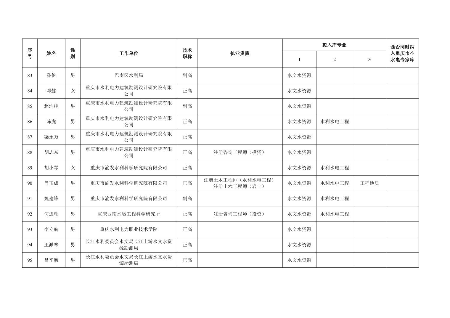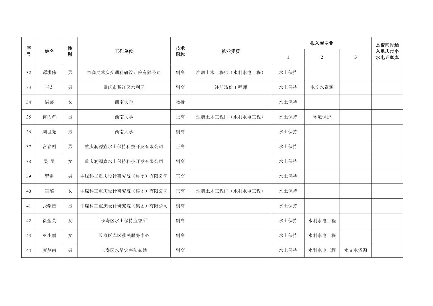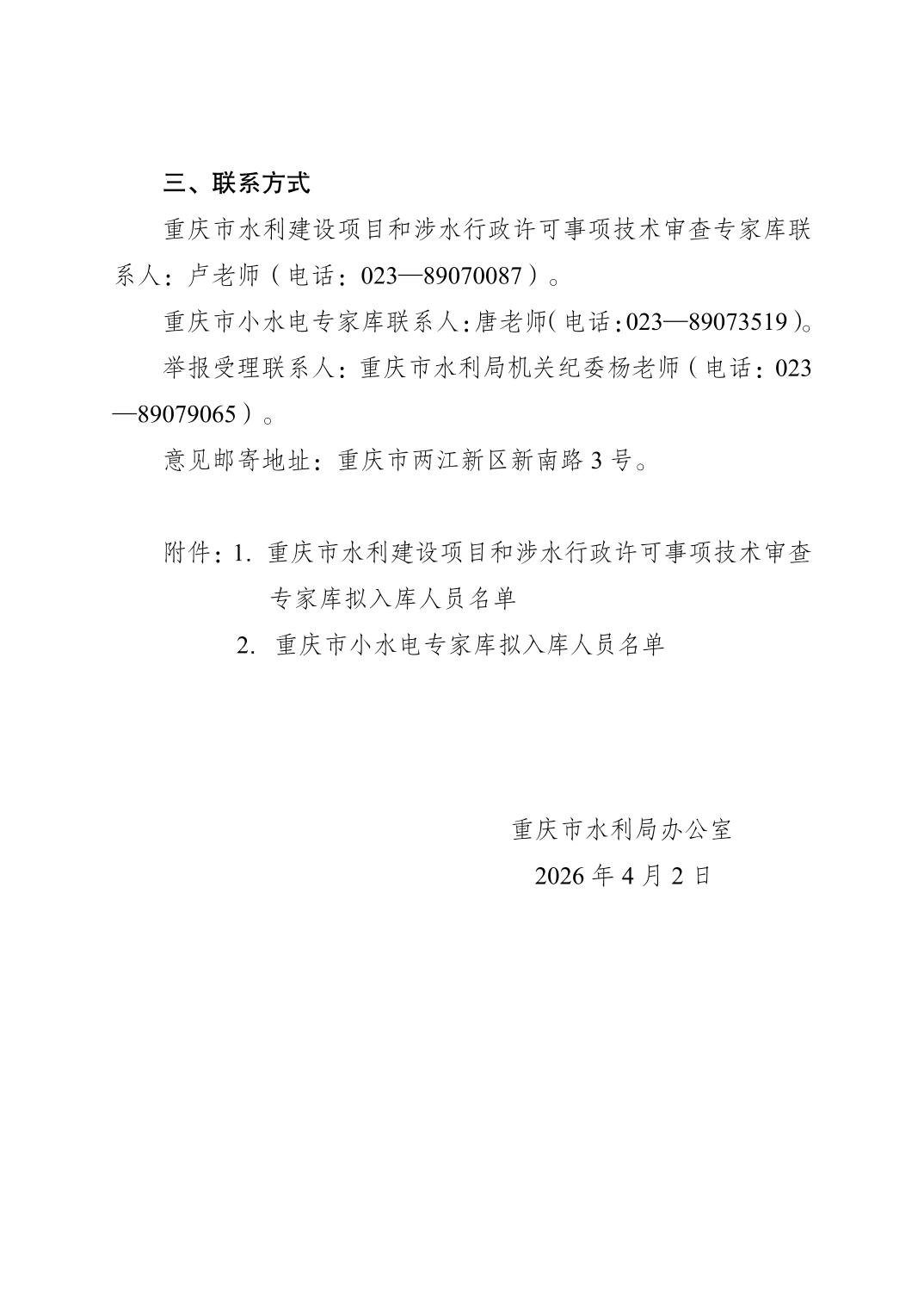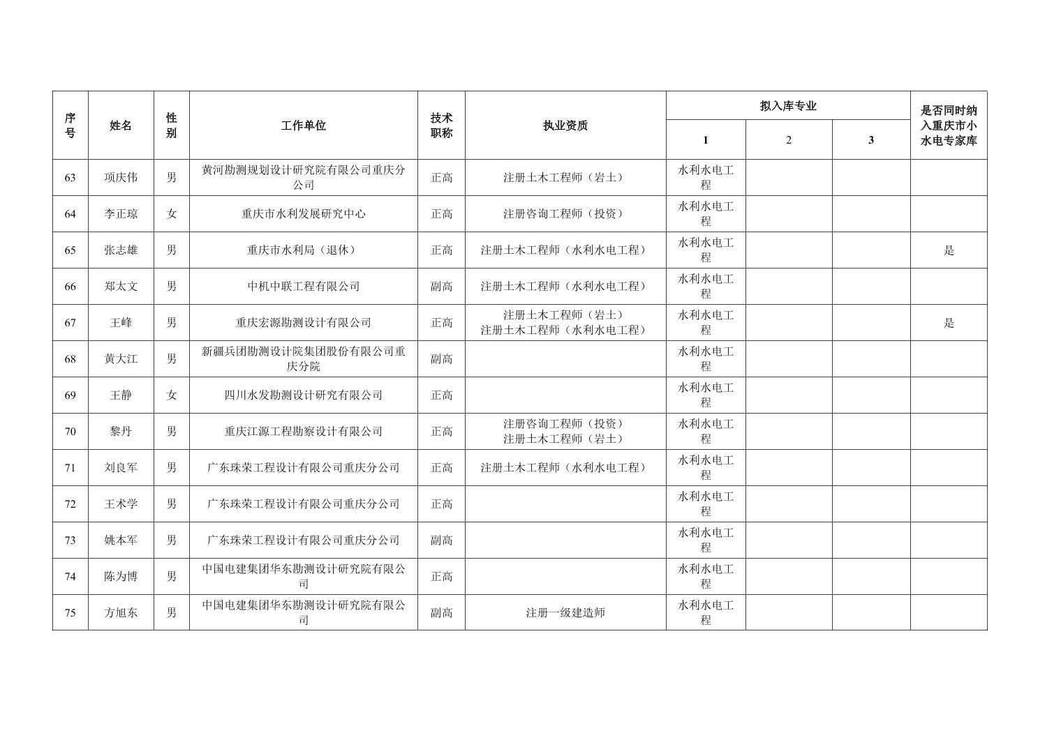 重庆市水利局办公室关于重庆市水利建设项目和涉水行政许可事项技术审查等两个专家库拟入库人员名单的公示