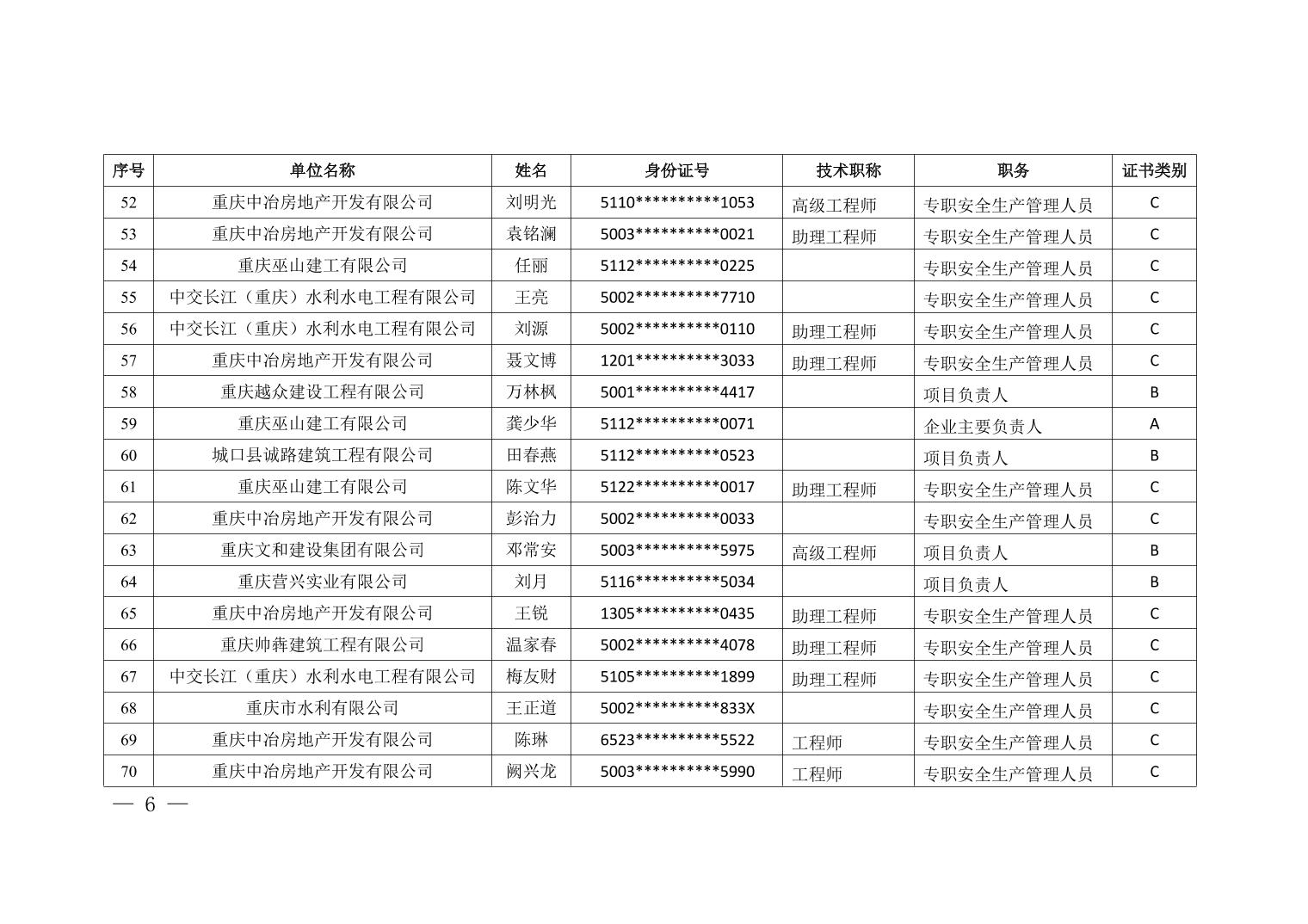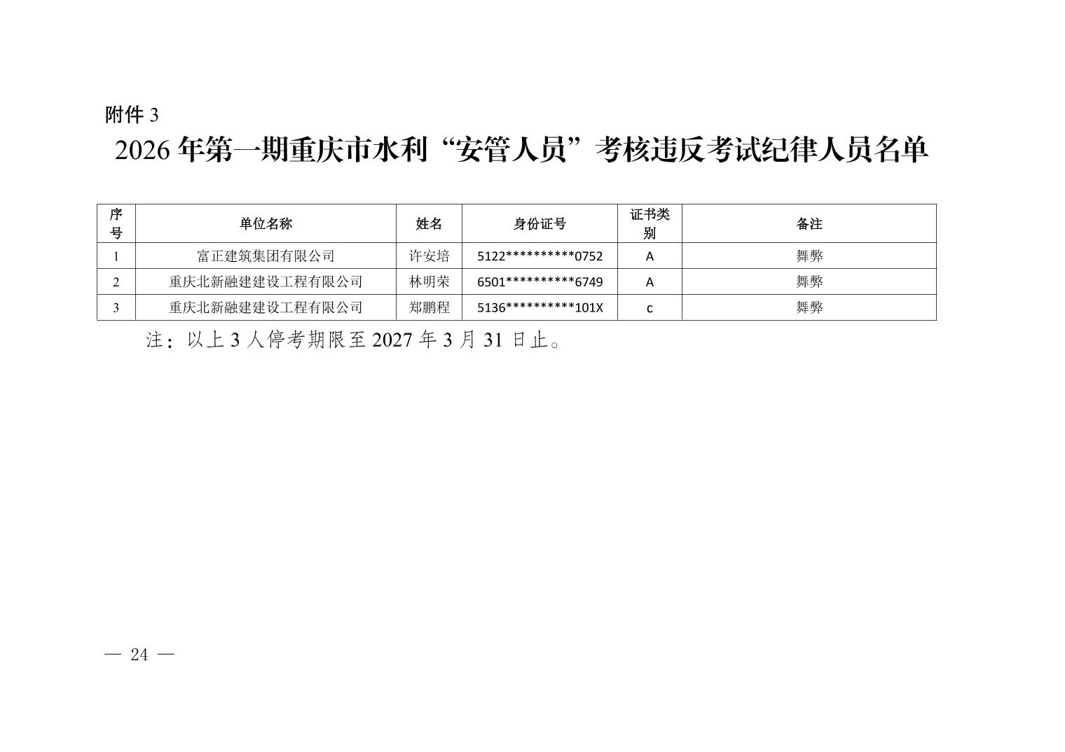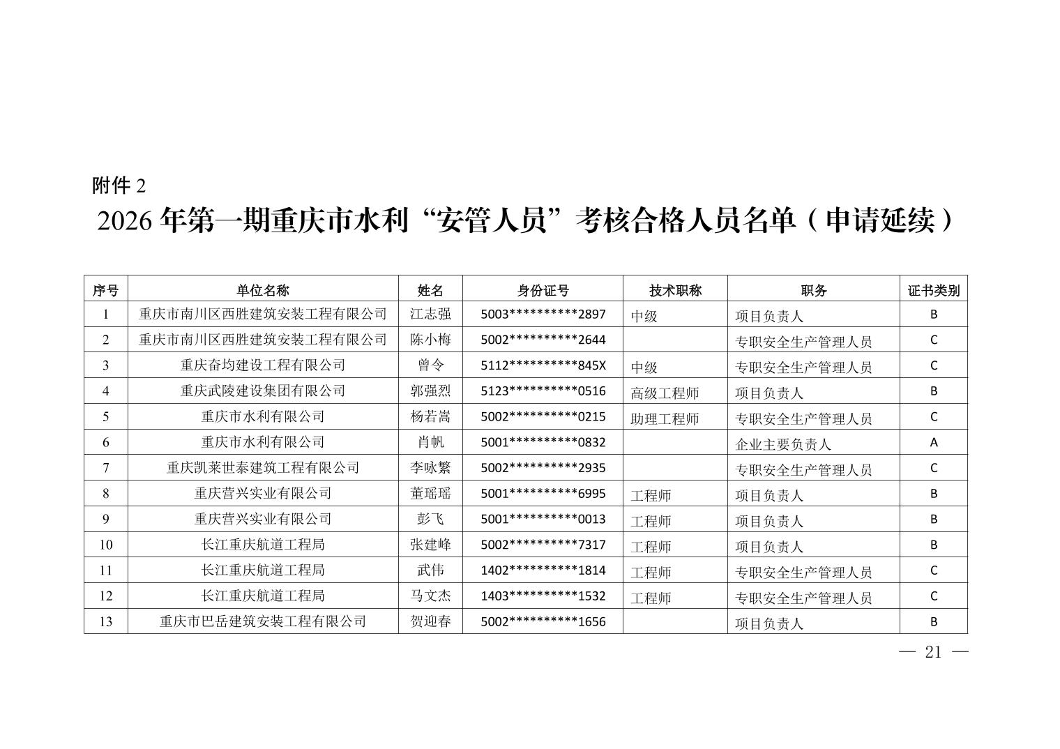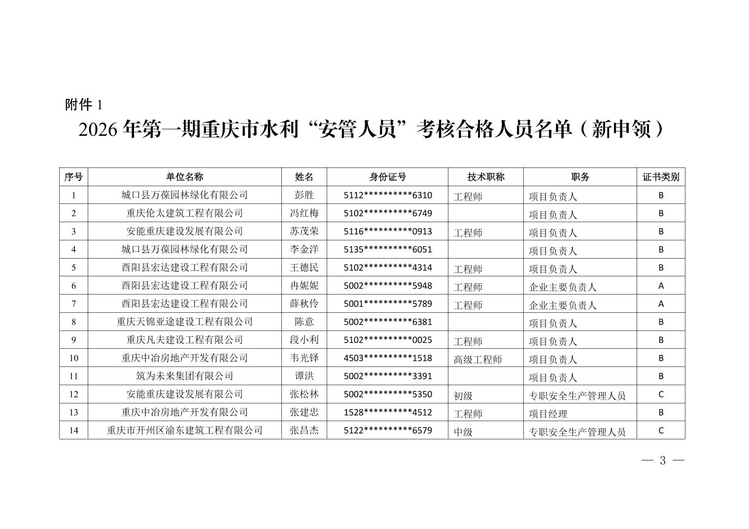 重庆市水利局办公室关于公布2026年度第一期水利水电工程施工企业“安管人员”安全生产考核管理合格人员名单的通知
